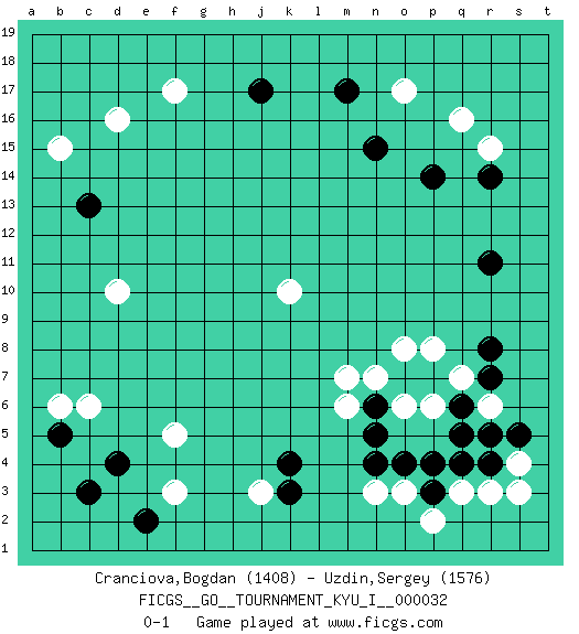 Last move : 0-1 2011 March 1 22:57:44 [Event "FICGS__GO__TOURNAMENT_KYU_I__000032 "] [Site "FICGS"] [Date "2010.11.07"] [Round "1"] [Black "Cranciova,Bogdan "] [White "Uzdin,Sergey "] [Result "0-1"] [Rating 1 "1408"] [Rating 2 "1576"] 1.d4 d16 2.q4 q16 3.r14 o17 4.r11 d10 5.k4 r6 6.r8 r3 7.r4 q3 8.p3 s4 9.s5 s3 10.r5 o3 11.p4 p2 12.o4 n3 13.n4 c6 14.j17 f17 15.m17 f3 16.c3 j3 17.k3 f5 18.b5 b6 19.e2 k10 20.n15 r15 21.p14 p6 22.o7 o6 23.n6 n7 24.p7 m6 25.n5 m7 26.q6 q7 27.q5 p8 28.r7 o8 29.c13 b15 0-1 Here are the names of the openings (joseki) played in the four corners : Corner q16 : q16 r14Hoshi (Hwajeom, Seongjeom, Xingwei`) 4-4 Point. The star or hoshi (4-4) point, emphasizing influence at the potential expense of territory.Ikken Kakari (Hankan Keolch'im, Yi Gua`jiao~, 1-Space Low Approach). Black 2 is the standard approach move to the 4-4. Corner q4 : q4 r6Hoshi (Hwajeom, Seongjeom, Xingwei`) 4-4 Point. The star or hoshi (4-4) point, emphasizing influence at the potential expense of territory.Ikken Kakari (Hankan Keolch'im, Yi Gua`jiao~, 1-Space Low Approach). White 2 is the standard approach move to the 4-4. Corner d4 : d4 c6Hoshi (Hwajeom, Seongjeom, Xingwei`) 4-4 Point. The star or hoshi (4-4) point, emphasizing influence at the potential expense of territory.Ikken Kakari (Hankan Keolch'im, Yi Gua`jiao~, 1-Space Low Approach). White 2 is the standard approach move to the 4-4. Corner d16 : d16 j17Hoshi (Hwajeom, Seongjeom, Xingwei`) 4-4 Point. The star or hoshi (4-4) point, emphasizing influence at the potential expense of territory. Player White won this Go (weiqi, baduk) game.Follow this game move after move (download ) The simplest move is the best move. (Anonymous) The question of whether computers can think is just like question of whether submarines can swim. (Edsger W. Dijkstra)
