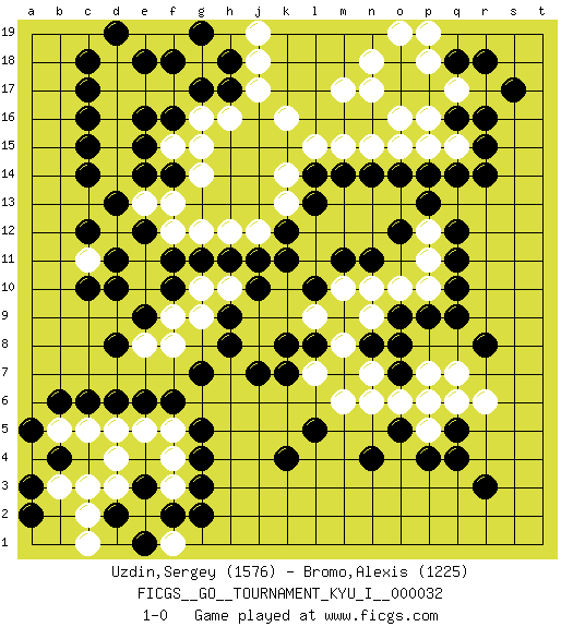 Last move : 1-0 2011 April 26 9:29:2 [Event "FICGS__GO__TOURNAMENT_KYU_I__000032"] [Site "FICGS"] [Date "2010.11.07"] [Round "1"] [Black "Uzdin,Sergey"] [White "Bromo,Alexis"] [Result "1-0"] [Rating 1 "1576"] [Rating 2 "1225"] 1.q16 d4 2.q4 d16 3.q10 k10 4.k4 k16 5.d10 c11 6.c6 c5 7.d6 d5 8.c10 o15 9.o17 m17 10.p14 o13 11.p13 p12 12.q12 p15 13.o12 p11 14.q11 p10 15.o14 n13 16.n14 n12 17.p9 o10 18.o9 n9 19.n8 n10 20.g3 f3 21.g4 f4 22.c14 q15 23.r15 n15 24.m14 m13 25.c16 d17 26.c17 d18 27.f16 f15 28.e15 g16 29.e16 d15 30.c15 d14 31.g17 h16 32.h17 j17 33.f14 g15 34.e14 g14 35.d13 f17 36.f18 e17 37.c18 g18 38.h18 j18 39.g19 j19 40.e18 f13 41.d19 d12 42.e12 f12 43.f11 g12 44.g11 h12 45.k8 l9 46.l8 k9 47.j11 j12 48.k11 l11 49.k12 k13 50.h11 h10 51.l13 l12 52.l14 k14 53.q14 m15 54.j10 j9 55.h9 g10 56.f10 g9 57.h8 f9 58.e9 f8 59.f6 e5 60.e6 f5 61.g5 l15 62.r14 p16 63.p17 q17 64.r16 r17 65.s17 p18 66.o18 n18 67.r18 n17 68.d11 e8 69.d8 j8 70.g7 e13 71.c12 o19 72.q18 p19 73.n4 o16 74.r3 r6 75.r8 q7 76.o8 q17 77.j7 m8 78.m7 l7 79.k7 n7 80.m9 m6 81.m11 m10 82.l10 m12 83.n11 m8 84.b6 b5 85.f2 e2 86.g2 f1 87.o7 l9 88.p6 o6 89.o5 n6 90.l5 p7 91.q9 p5 92.q5 q6 93.p4 p6 94.d2 c2 95.e3 d3 96.e1 c1 97.a5 a4 98.b4 c3 99.a3 b3 100.a2 1-0 Here are the names of the openings (joseki) played in the four corners : Corner d4 : d4 c6 Hoshi (Hwajeom, Seongjeom, Xingwei`) 4-4 Point. The star or hoshi (4-4) point, emphasizing influence at the potential expense of territory. Ikken Kakari (Hankan Keolch'im, Yi Gua`jiao~, 1-Space Low Approach). Black 2 is the standard approach move to the 4-4. Corner q16 : q16 o15 Hoshi (Hwajeom, Seongjeom, Xingwei`) 4-4 Point. The star or hoshi (4-4) point, emphasizing influence at the potential expense of territory. Player Black won this Go (weiqi, baduk) game. Follow this game move after move (download)White is always trying to kill a bigger group than black is trying to save. (Anonymous) Luck is when opportunity knocks and you answer. (Anonymous)