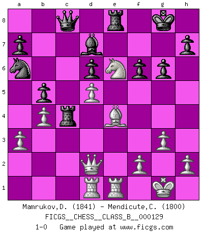 Last move : 1-0 2011 January 10 19:50:19 [Event "FICGS__CHESS__CLASS_B__000129"] [Site "FICGS"] [Date "2010.11.07"] [Round "1"] [White "Mamrukov,Dmitri"] [Black "Mendicute,Claudio"] [Result "1-0"] [WhiteElo "1841"] [BlackElo "1800"] 1.d4 f5 2.Nf3 Nf6 3.g3 g6 4.Bg2 Bg7 5.O-O O-O 6.b3 d6 7.Bb2 Qe8 8.c4 Na6 9.Qc2 Rb8 10.a3 Kh8 11.Nc3 c6 12.Rfe1 b5 13.cxb5 cxb5 14.d5 Bd7 15.b4 Rc8 16.Qd2 Rc4 17.e4 fxe4 18.Ng5 Qc8 19.Rac1 Kg8 20.Ncxe4 Nxe4 21.Bxe4 Bf6 22.Bxf6 exf6 23.Ne6 Re8 24.Rcd1 1-0 Dutch Kingside Castling by player White (move 5) Kingside Castling by player Black (move 5) Player White won this chess game. Follow this game move after move (download)Chess, like love, is infectious at any age. (Flohr) Frage: Was machen Sie mit den Preisen? Anwort: Ich habe Angst, dass meine Freundin davon neue Kleider kauft. (Loek van Wely) Solo existe una cosa que Fischer hace en el Ajedrez sin placer: ¡perder!. (Boris Spassky) Les échecs sont plus proches de l'art de l'assassinat que de l'art de la guerre. (Arturo Perez-Reverte) Dave, my mind is going. I can feel it. (HAL 9000 in 2001, a space odyssey)