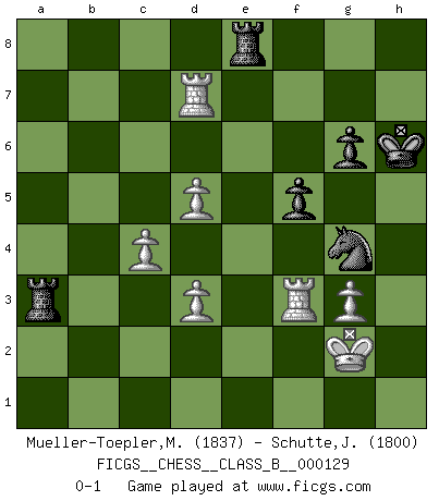 Last move : 0-1 2011 April 17 9:24:52 [Event "FICGS__CHESS__CLASS_B__000129"] [Site "FICGS"] [Date "2010.11.07"] [Round "1"] [White "Mueller-Toepler,Michael"] [Black "Schutte,John"] [Result "0-1"] [WhiteElo "1837"] [BlackElo "1800"] 1.e4 c5 2.f3 Nc6 3.Nc3 e6 4.Bb5 Nd4 5.Nge2 a6 6.Bd3 Qh4+ 7.Kf1 Nc6 8.Qe1 Qd8 9.b3 Nf6 10.Qg3 g6 11.Bb2 Bg7 12.Qd6 b6 13.h4 e5 14.Nd5 Nxd5 15.Qxd5 Bb7 16.h5 Qe7 17.Bc4 b5 18.Nc3 Nd8 19.Qd3 bxc4 20.Qxc4 O-O 21.Nd5 Qd6 22.hxg6 hxg6 23.g3 Ne6 24.Kg2 f5 25.Raf1 a5 26.d3 Bxd5 27.Qxd5 Qxd5 28.exd5 Nc7 29.c4 a4 30.f4 axb3 31.axb3 exf4 32.Bxg7 Kxg7 33.Rxf4 Ne8 34.Rb1 Nf6 35.b4 cxb4 36.Rxb4 Ra3 37.Rf3 Re8 38.Rb7 Ng4 39.Rxd7+ Kh6 0-1 Sicilian defense Kingside Castling by player Black (move 20) Player Black won this chess game. Follow this game move after move (download)Though most people love to look at the games of the great attacking masters, some of the most successful players in history have been the quiet positional players. They slowly grind you down by taking away your space, tying up your pieces, and leaving you with virtually nothing to do ! (Yasser Seirawan) Sitze auf Deine Hände. (Siegbert Tarrasch) El Ajedrez es en su esencia, un juego. En su forma, un arte. Y en su ejecución, una ciencia. (Baron Tassilo) Les échecs sont un jeu terrible. Si vous n'avez pas le centre, votre adversaire a une position plus libre. Par contre, si vous avez le centre, alors vous avez vraiment quelque chose pour laquelle vous inquiéter ! (Siegbert Tarrasch) Wisdom is the reward you get for a lifetime of listening when you'd have preferred to talk. (Doug Larson)