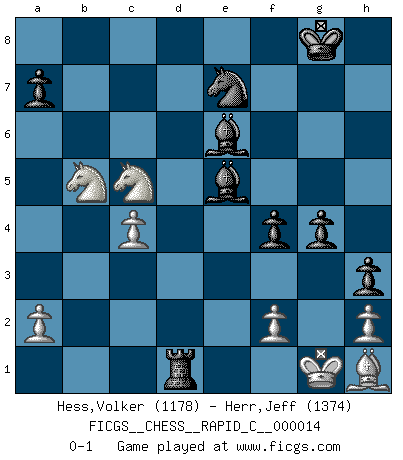 Last move : 0-1 2007 January 17 14:17:37 [Event "FICGS__CHESS__RAPID_C__000014"] [Site "FICGS"] [Date "2006.11.28"] [Round "1"] [White "Hess,Volker"] [Black "Herr,Jeff"] [Result "0-1"] [WhiteElo "1178"] [BlackElo "1374"] 1.c4 e5 2.Nc3 f5 3.g3 Nf6 4.Bg2 d6 5.d3 Be7 6.Bg5 h6 7.Bxf6 Bxf6 8.Nf3 Nc6 9.O-O Ne7 10.Rb1 Be6 11.Nb5 c6 12.Na3 g5 13.b4 g4 14.Nd2 h5 15.b5 h4 16.bxc6 bxc6 17.Qa4 Qd7 18.Rb7 Qxb7 19.Rb1 Qd7 20.Nb3 O-O 21.Na5 Rfc8 22.Rb7 Qe8 23.Qb4 c5 24.Qb5 Qxb5 25.Rxb5 Rab8 26.Nb7 Rc7 27.Nxd6 Rxb5 28.Naxb5 Rd7 29.e4 h3 30.Bh1 f4 31.gxf4 exf4 32.e5 Bxe5 33.Ne4 Rxd3 34.Nxc5 Rd1+ 0-1 English Opening Kingside Castling by player White (move 9) Kingside Castling by player Black (move 20) Player Black won this chess game. Follow this game move after move (download)Chess is like life. (Boris Spassky) Es tut gut, die Entwicklungsperiode von, [...] demokratischem Geist durchdringen zu lassen. Wie undemokratisch wäre es doch beispielsweise, den einen Offizier große Spaziertouren vornehmen zu lassen, während die anderen zu Hause säßen und sich entsetzlich langweilten. (Aaron Nimzowitsch) Yo no creo en la psicología. Yo creo en las buenas movidas. (Bobby Fischer) Les échecs, c'est l'imagination. (David Bronstein) The leaves of memory seemed to make a mournful rustling in the dark. (Henry Wadsworth Longfellow)