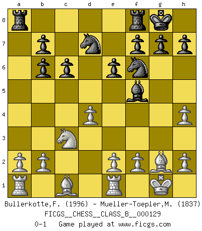 Last move : 0-1 2011 March 16 12:21:40 [Event "FICGS__CHESS__CLASS_B__000129"] [Site "FICGS"] [Date "2010.11.07"] [Round "1"] [White "Bullerkotte,Frank"] [Black "Mueller-Toepler,Michael"] [Result "0-1"] [WhiteElo "1996"] [BlackElo "1837"] 1.d4 d5 2.c4 c6 3.Nf3 Nf6 4.Qb3 dxc4 5.Qxc4 Bf5 6.Nc3 e6 7.g3 Nbd7 8.Bg2 Be7 9.O-O O-O 10.Re1 Ne4 11.Qb3 Qb6 12.Nh4 Bxh4 13.gxh4 Nef6 14.Qxb6 axb6 0-1 This chess game has been lost on time (started : 2010.11.07 9:55:0) QGD Slav : 3.Nf3 Kingside Castling by player White (move 9) Kingside Castling by player Black (move 9) Player Black won this chess game. Follow this game move after move (download)War is the child of passion, passion is the child of narcissism and narcissism is the child. (...) Another game ? (Thibault de Vassal) Obwohl ich alt bin, darf mir niemand den Finger in den Mund stecken, sonst beisse ich. (Wilhelm Steinitz) Todavía soy una víctima del Ajedrez. Tiene toda la belleza del arte y mucho mas. No puede ser comercializado. El Ajedrez es mas puro que el arte en su posición social. (Marcel Duchamp) Les échecs sont utiles à l'exercice de la faculté de penser et à celle de l'imagination. Car nous devons posséder une méthode élaborée pour atteindre des buts partout où nous devons conduire notre raison. (Leibnitz) It is not titles that honor men, but men that honor titles. (Niccolo Machiavelli)