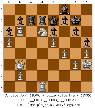 Last move : 1-0 2011 March 31 14:7:46 [Event "FICGS__CHESS__CLASS_B__000129"] [Site "FICGS"] [Date "2010.11.07"] [Round "1"] [White "Schutte,John"] [Black "Bullerkotte,Frank"] [Result "1-0"] [WhiteElo "1800"] [BlackElo "1996"] 1.e4 c6 2.d4 d5 3.e5 c5 4.dxc5 Nc6 5.Nf3 Bg4 6.c3 e6 7.Be3 Bxf3 8.Qxf3 Nge7 9.Bb5 a6 10.Bxc6+ Nxc6 11.Qg3 d4 12.Bxd4 Nxd4 13.cxd4 Qxd4 14.Nc3 g6 15.Rd1 Qxc5 16.O-O Qc6 17.Qe3 Bg7 18.Rd6 Qc7 19.f4 O-O 20.Ne4 Rac8 21.Rb6 Qd7 22.Nd6 Rc7 23.Qb3 Rd8 24.g3 Bf8 25.Rd1 Qe7 26.Kg2 Kg7 27.h4 h5 28.Kh3 R8d7 29.a3 Kh8 30.Rd3 Kg8 31.a4 Kg7 32.a5 Kg8 33.Rd4 Kg7 34.Rd1 1-0 Caro-Kann : Advance variation Kingside Castling by player White (move 16) Kingside Castling by player Black (move 19) Player White won this chess game. Follow this game move after move (download)There must have been a time when men were demigods, or they could not have invented Chess. (Gustav Schenk) Das typische an einem Großmeister ist, daß er eine gewonnene Position schnell und schmerzlos gewinnt. (Irving Chernev) Alekhine es un poeta que crea un trabajo de arte de algo que raramente inspiraría a otra persona a mandar una tarjeta postal. (Max Euwe) Il s'avisa de me proposer d'apprendre les échecs qu'il jouait un peu... me voilà forcené des échecs. J'achète un échiquier, je m'enferme dans ma chambre, j'y passe des jours et des nuits à vouloir apprendre par cur toutes les parties. (Jean-Jacques Rousseau, Confessions) Be who you are, and say what you feel because those who mind don't matter, and those who matter don't mind. (Dr Seuss)