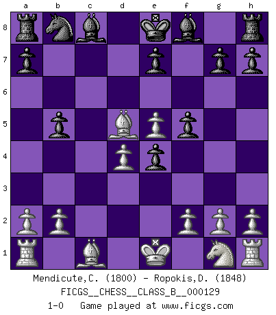 Last move : 1-0 2010 November 23 7:59:42 [Event "FICGS__CHESS__CLASS_B__000129"] [Site "FICGS"] [Date "2010.11.07"] [Round "1"] [White "Mendicute,Claudio"] [Black "Ropokis,Dimitrios"] [Result "1-0"] [WhiteElo "1800"] [BlackElo "1848"] 1.e4 c6 2.d4 d5 3.Nc3 Nf6 4.e5 Ne4 5.Nxe4 dxe4 6.Bc4 b5 7.Bb3 c5 8.c3 cxd4 9.Qxd4 Qxd4 10.cxd4 f5 11.Bd5 1-0 Caro-Kann defense Player White won this chess game. Follow this game move after move (download)When I have White, I win because I am white; When I have Black, I win because I am Bogolyubov. (Bogolyubov) Die Auseinandersetzung mit Karpow war politisch geprägt. Er stand für das kommunistische System, wurde von dessen Repräsentanten gehätschelt. Ich war der Oppositionelle. Jeder Schachweltmeister spiegelt auch die gesellschaftlichen Verhältnisse wider. Kramnik steht für die Börsen-Generation des Neuen Markts, ideologiefrei, zahlenfixiert. (Garry Kasparov) Hay dos clases de hombres: aquellos que se conforman en dejarse llevar por las circunstancias y que juegan barajas y aquellos decididos a controlar las circunstancias y que juegan al Ajedrez. (Mortimer Collins) Un journaliste : 'Vous préférez avoir une dame de plus sur l'échiquier ou au lit ?' Boris Spassky : 'Ca dépend de la position.' Warrior pose battles inner weakness and wins focus. You see that there is no war within you. You're on your own side, and you are your own strength. (Terri Guillemets)