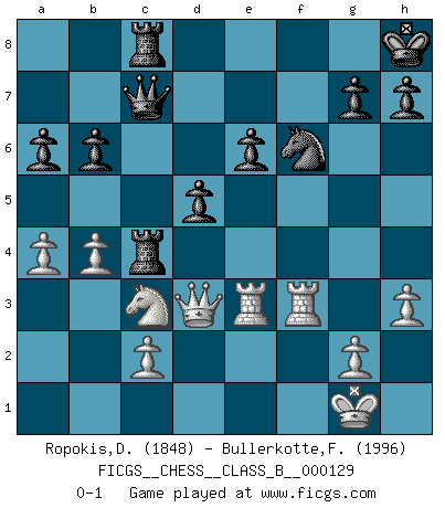 Last move : 0-1 2011 January 8 12:5:30 [Event "FICGS__CHESS__CLASS_B__000129"] [Site "FICGS"] [Date "2010.11.07"] [Round "1"] [White "Ropokis,Dimitrios"] [Black "Bullerkotte,Frank"] [Result "0-1"] [WhiteElo "1848"] [BlackElo "1996"] 1.e4 c6 2.f4 d5 3.exd5 cxd5 4.d4 Nc6 5.Nf3 Bg4 6.Nc3 Nf6 7.Be2 e6 8.O-O Rc8 9.h3 Bxf3 10.Bxf3 Nxd4 11.Be3 Nxf3+ 12.Rxf3 Bc5 13.Bxc5 Rxc5 14.Qd4 b6 15.f5 O-O 16.fxe6 fxe6 17.Re1 Qd6 18.b3 Qc6 19.Ref1 Qc7 20.a4 a6 21.Qd3 Re8 22.Re1 Rc8 23.R1e3 Kh8 24.b4 Rc4 0-1 Caro-Kann defense Kingside Castling by player White (move 8) Kingside Castling by player Black (move 15) Player Black won this chess game. Follow this game move after move (download)During a Chess competition a Chessmaster should be a combination of a beast of prey and a monk. (Alexander Alekhine) Smyslow ist ein Beweis dafür, dass ich noch zehn Jahre spielen kann! [der 75 jährige über den 85 jährigen] (Viktor Kortschnoi) Fischer deseaba darle a los Rusos una sopa de su propia medicina. (Larry Evans) Le génie consiste à savoir transgresser les règles au moment opportun. (Teichmann) There is a very easy way to return from a casino with a small fortune : go there with a large one. (Jack Yelton)
