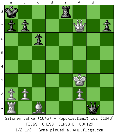 Last move : 1/2-1/2 2011 January 3 19:37:21 [Event "FICGS__CHESS__CLASS_B__000129"] [Site "FICGS"] [Date "2010.11.07"] [Round "1"] [White "Salonen,Jukka"] [Black "Ropokis,Dimitrios"] [Result "1/2-1/2"] [WhiteElo "1845"] [BlackElo "1848"] 1.e4 c6 2.d4 d5 3.e5 Bf5 4.Nf3 e6 5.Be2 Ne7 6.Nbd2 Nd7 7.O-O Qc7 8.Nh4 O-O-O 9.Ndf3 f6 10.exf6 gxf6 11.Nxf5 Nxf5 12.c4 dxc4 13.Bxc4 e5 14.Be6 Nxd4 15.Nxd4 exd4 16.Qxd4 Kb8 17.Bxd7 Rxd7 18.Qxf6 Bg7 19.Qe6 Re7 20.Qb3 Be5 21.g3 Rhe8 22.Re1 Bxg3 23.Rxe7 Bxh2+ 24.Kg2 Qxe7 25.Kxh2 Qh4+ 26.Kg2 Qe4+ 27.Kh3 Qh1+ 28.Kg3 Ka8 29.Qf7 Qg1+ 30.Kf3 1/2-1/2 Caro-Kann : Advance variation Kingside Castling by player White (move 7) Queenside Castling by player Black (move 8) This chess game ended in a draw. Follow this game move after move (download)Your body has to be in top condition. Your Chess deteriorates as your body does. You can't separate body from mind. (Bobby Fischer) Der Bart als Geschlechtszeichen mitten im Gesicht ist obszön. Daher gefällt er den Weibern. [Zugegeben, kein Schachzitat, aber unglaublich originell] (Arthur Schopenhauer) Cuando tu no sabes absolutamente que mas hacer, es tiempo de entrar en pánico. (John van der Wiel) Même un GMI sait rarement calculer sur plus de cinq coups une attaque à sacrifices. (Rudolf Spielmann) Crush them ! Make them suffer ! (General Grievous in Star Wars ep.3)