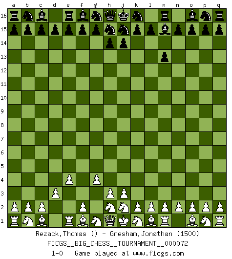 Last move : 1-0 2010 December 9 22:24:40 [Event "FICGS__BIG_CHESS__TOURNAMENT__000072"] [Site "FICGS"] [Date "2010.11.07"] [Round "1"] [White "Rezack,Thomas"] [Black "Gresham,Jonathan"] [Result "1-0"] [WhiteElo ""] [BlackElo "1500"] 1.g2-g4 m15-m13 2.d2-d3 l16-m15 3.e2-e4 1-0 This big chess game has been lost on time (started : 2010.11.07 10:14:0) Follow this game move after move (download)Tactics flow from a superior position. (Bobby Fischer) Schach ist gnadenlos. Du mußt bereit sein zu töten. (Nigel Short) Cada Peón es una Reina en potencia. (James Mason) Botvinnik disait en comparant les échecs à la musique: Il existe une science dont le but est l'étude de l'acoustique et des sons. Mais il y a aussi un art qui se sert de l'océan des sons : c'est la musique. De toute évidence, il en est de même pour la pensée. La logique est l'étude des lois de la réflexion et les échecs reflètent, en tant qu'art, le côté logique de la réflexion, sous la forme d'images artistiques... Extrait de Fischer - Spassky, Reykjavik 1972 par Alexander & F. Wyndham (Ed. Solar), p 37. A good aphorism is too hard for the tooth of time, and is not worn away with the centuries, although it serves as food for every speech. (Friedrich Nietzsche)