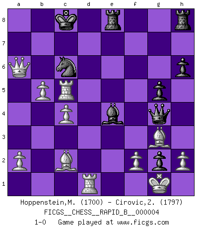 Last move : 1-0 2006 May 27 16:52:50 [Event "FICGS__CHESS__RAPID_B__000004"] [Site "FICGS"] [Date "2006.04.30"] [Round "1"] [White "Hoppenstein,Michael"] [Black "Cirovic,Zeljko"] [Result "1-0"] [WhiteElo "1700"] [BlackElo "1797"] 1.d4 d5 2.Nf3 Nf6 3.e3 e6 4.Bd3 c5 5.c3 Nc6 6.Nbd2 h6 7.O-O c4 8.Bc2 Bd6 9.e4 dxe4 10.Nxe4 b5 11.Nxf6+ Qxf6 12.Nd2 Bb7 13.Ne4 Qe7 14.Qh5 O-O-O 15.Qxb5 f5 16.Nxd6+ Qxd6 17.Qxc4 g5 18.b4 Kb8 19.Re1 Rde8 20.b5 Nd8 21.Qa4 f4 22.c4 Qxd4 23.Ba3 f3 24.Rad1 Qg4 25.Bd6+ Kc8 26.Bg3 fxg2 27.Qxa7 e5 28.Rxe5 Be4 29.Rc5+ Nc6 30.Qa6+ 1-0 Colle system Kingside Castling by player White (move 7) Queenside Castling by player Black (move 14) Player White won this chess game. Follow this game move after move (download)The passed pawn is a criminal, who should be kept under lock and key. Mild measures, such as police surveillance, are not sufficient. (Nimzovitch) Ich glaube, ich kenne inzwischen die Gründe für mein Versagen: schachliche Charakterfehler. Ich war nie ein Wunderkind und in meiner gesamten menschlichen Entwicklung immer zu langsam. (Viktor Kortschnoi) En el tablero, la mentira e hipocresía no sobreviven mucho. (Emanuel Lasker) La victoire dans une partie d'Echecs appartient la plupart du temps à celui qui voit un peu plus loin que l'adversaire. (Lasker) Crush them ! Make them suffer ! (General Grievous in Star Wars ep.3)