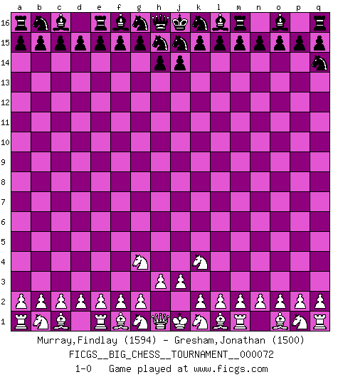 Last move : 1-0 2010 December 12 10:29:52 [Event "FICGS__BIG_CHESS__TOURNAMENT__000072"] [Site "FICGS"] [Date "2010.11.07"] [Round "1"] [White "Murray,Findlay"] [Black "Gresham,Jonathan"] [Result "1-0"] [WhiteElo "1594"] [BlackElo "1500"] 1.j2-k4 p16-q14 2.h2-g4 1-0 This big chess game has been lost on time (started : 2010.11.07 10:14:0) Follow this game move after move (download)Fischer is under obligation to nobody. (Joseph Platz) Ein bischen Romantik kann weder im Schach noch in der Liebe schaden. Also versuche ich mich ab und zu daran zu erinnern. (Nigel Short) No es una movida, aún la mejor movida que tu debas buscar, sino un plan comprensible. (Eugene Znosko-Borovsky) Mon pion favori sur ma case favorite ! Bronstein en parlant d'un coup de pion en h5 quand il avait les Noirs. The Internet is so big, so powerful and pointless that for some people it is a complete substitute for life. (Andrew Brown)
