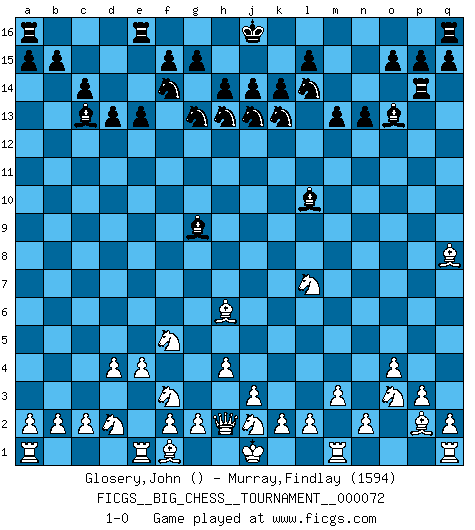 Last move : 1-0 2011 January 9 22:45:47 [Event "FICGS__BIG_CHESS__TOURNAMENT__000072"] [Site "FICGS"] [Date "2010.11.07"] [Round "1"] [White "Glosery,John"] [Black "Murray,Findlay"] [Result "1-0"] [WhiteElo ""] [BlackElo "1594"] 1.h2-f3 j15-k13 2.f3-h4 h15-g13 3.j2-g3 e15-e13 4.p2-p3 d15-d13 5.d2-d4 f16-c13 6.o1-p2 c15-c14 7.m2-m3 m15-m13 8.g1-j2 h16-o10 9.o2-o4 n15-n13 10.l1-m2 l16-o13 11.e2-e4 o16-g9 12.c1-h6 c16-k9 13.m2-k4 b16-d15 14.b1-d2 k16-h15 15.g3-f5 m16-m14 16.h1-h2 p16-n15 17.k1-l3 g16-j15 18.l3-m5 j15-h13 19.h4-f3 d15-f14 20.h3-h4 n15-l14 21.k4-j5 h15-j13 22.j5-o10 k15-k14 23.m5-l7 k9-l10 24.p1-o3 m14-p14 25.o10-q8 1-0 This big chess game has been lost on time (started : 2010.11.07 10:14:0) Follow this game move after move (download)Nowadays, when you're not a grandmaster at 14, you can forget about it. (Anand Viswanathan) Mein erstes Ziel war nicht, die Partie zu gewinnen, sondern eine Figur zu opfern. -- der junge (Wilhelm Steinitz) Hasta este punto, las blancas han seguido un análisis bien conocido. Pero ahora el hace un error fatal: empieza a usar su propia cabeza. (Siegbert Tarrasch) Le thème de l'attaque double intervient d'une manière ou d'une autre dans l'immense majorité des combinaisons. (Youri Averbakh) Macintosh - we might not get everything right, but at least we knew the century was going to end. (Douglas Adams)