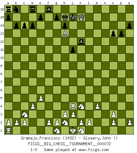 Last move : 1-0 2010 December 8 6:29:56 [Event "FICGS__BIG_CHESS__TOURNAMENT__000072"] [Site "FICGS"] [Date "2010.11.07"] [Round "1"] [White "Gramajo,Francisco"] [Black "Glosery,John"] [Result "1-0"] [WhiteElo "1432"] [BlackElo ""] 1.j2-k4 k16-l14 2.e2-e4 b15-b14 3.p1-o3 k15-k14 4.n2-n4 l16-k15 5.d2-d4 n15-n14 6.f1-c4 c16-b15 7.c1-o12 q15-q14 8.o12-l15 m16-l16 9.l15-o12 p15-p13 10.o12-k8 o16-p15 11.e4-e5 b15-n4 12.m1-n1 n4-b15 13.m2-m4 b15-o3 14.p2-o3 p16-n15 15.b1-c3 e16-c16 16.l1-o4 d15-d14 17.c4-h9 c15-c14 18.h1-o7 o15-o13 19.o7-f15 h15-f14 20.o1-d11 j16-k16 21.f15-m9 m15-m13 22.e1-e4 j14-j13 23.n1-n14 k15-h13 24.m9-n9 q16-n16 25.h9-m13 l16-l15 26.d11-f9 h13-k15 27.q1-n1 p15-o16 28.k8-n11 k14-k13 29.n11-j15 g16-j15 30.n9-k9 c16-d16 31.o4-h10 k15-g12 32.f9-h11 g12-h11 33.k9-h11 j13-j12 34.h11-h12 j15-g14 35.h12-g11 h16-h15 36.m13-l14 f14-h13 37.g11-o11 n16-l16 38.h10-n15 o16-n15 39.n1-n13 n15-k12 40.n13-k13 k16-j15 41.e4-j4 j12-j11 42.k13-k15 l15-k15 43.l14-k15 l16-k16 44.k15-h13 g14-j13 45.n14-n15 j13-k15 46.n15-k15 k16-k15 47.o11-k15 1-0 Follow this game move after move (download)It's just you and your opponent at the board and you're trying to prove something. (Bobby Fischer) Ich war schon mal beim Dopingtest. Da musste ich Urin abgeben, während Dritte zusahen. (Elisabeth Pähtz) El Ajedrez detiene a su maestro dentro de sus propios vínculos, encadenando la mente y el cerebro, por lo que la libertad interior del mas fuerte debe sufrir. (Albert Einstein) La solitude du joueur d'Echecs à l'approche du mat est semblable à celle du condamné. (Francis Szpiner) Programming can only do so much before it becomes too much. (Don Groves)