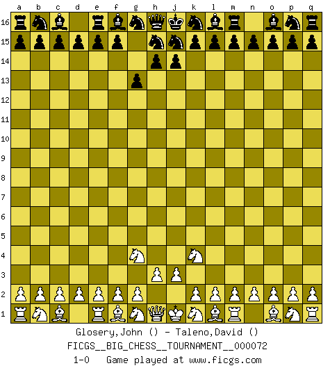 Last move : 1-0 2011 January 17 11:14:19 [Event "FICGS__BIG_CHESS__TOURNAMENT__000072"] [Site "FICGS"] [Date "2010.11.07"] [Round "1"] [White "Glosery,John"] [Black "Taleno,David"] [Result "1-0"] [WhiteElo ""] [BlackElo ""] 1.h2-g4 g15-g13 2.j2-k4 1-0 Follow this game move after move (download)We don't really know how the game was invented, though there are suspicions. As soon as we discover the culprits, we'll let you know. (Bruce Pandolfini) Wenn ich einen Club besuche, sind die Spieler stumm vor Staunen. (José Raúl Capablanca) Cuando tu no sabes absolutamente que mas hacer, es tiempo de entrar en pánico. (John van der Wiel) Ce qui est bien, c'est d'avoir tout un tas de pièces en prise : l'adversaire ne peut en prendre qu'une à la fois. Cité par Thierry Audin. The problem with troubleshooting is that trouble shoots back. (Anonymous)