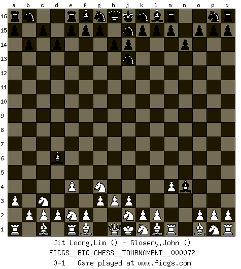 Last move : 0-1 2010 December 25 10:41:47 [Event "FICGS__BIG_CHESS__TOURNAMENT__000072"] [Site "FICGS"] [Date "2010.11.07"] [Round "1"] [White "Jit Loong,Lim"] [Black "Glosery,John"] [Result "0-1"] [WhiteElo ""] [BlackElo ""] 1.n2-n4 h15-j13 2.h2-g4 n15-n14 3.e2-e4 d15-d14 4.m2-m4 b15-b14 5.b1-c3 o16-b4 6.g1-e2 c16-b15 7.a2-a3 b4-d6 8.g2-g3 b15-n4 0-1 This big chess game has been lost on time (started : 2010.11.07 10:14:0) Follow this game move after move (download)Best by test: 1. e4 (Bobby Fischer) Oft bringt ein stiller Zug das Erdbeben. (Richard Reti) El Ajedrez por encima de todo... ¡es una pelea!. (Emanuel Lasker) C'est la seule position que je connaisse où les deux camps sont mals. Propos prêtés à V. Anand. For peace of mind, resign as general manager of the universe. (Douglas Adams)