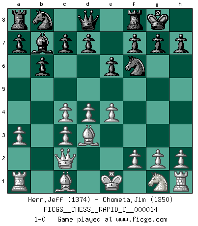 Last move : 1-0 2007 January 17 6:31:41 [Event "FICGS__CHESS__RAPID_C__000014"] [Site "FICGS"] [Date "2006.11.28"] [Round "1"] [White "Herr,Jeff"] [Black "Chometa,Jim"] [Result "1-0"] [WhiteElo "1374"] [BlackElo "1350"] 1.d4 Nf6 2.c4 e6 3.Nc3 Bb4 4.a3 Bxc3+ 5.bxc3 O-O 6.Qc2 b6 7.e4 Bb7 8.Bd3 1-0 This chess game has been lost on time (started : 2006.11.28 9:38:32) Nimzo-Indian : Saemisch variation Kingside Castling by player Black (move 5) Player White won this chess game. Follow this game move after move (download)Of Chess it has been said that life is not long enough for it, but that is the fault of life, not Chess. (William Ewart Napier) Ich kenne Menschen, die allen Willen der Welt besitzen und doch nicht Schach spielen können. (Robert James Fischer) Morphy probablemente fue el genio más grande de todos. (Bobby Fischer) Votre prénom est 'Tactique', votre deuxième prénom est 'Tactique' et votre nom est 'Tactique'. (Ken Smith) I find your interest interesting. (Gregory House, House M.D.)