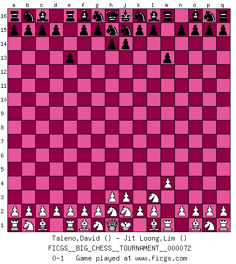 Last move : 0-1 2011 January 17 11:14:19 [Event "FICGS__BIG_CHESS__TOURNAMENT__000072"] [Site "FICGS"] [Date "2010.11.07"] [Round "1"] [White "Taleno,David"] [Black "Jit Loong,Lim"] [Result "0-1"] [WhiteElo ""] [BlackElo ""] 1.m2-m4 e15-e13 2.k1-l3 m15-m13 0-1 Follow this game move after move (download)I play correspondence chess because it is both art and science while chess is art only. (A player at FICGS) Ich verstehe mehr vom Schach als irgendein anderer lebender Meister. (José Raúl Capablanca) El Ajedrez demanda una total concentración. (Bobby Fischer) Si rien de grave n'est détecté lors de l'analyse d'une position, on joue alors le coup. Seconde règle de Blumenfeld. However beautiful the strategy, you should occasionally look at the results. (Winston Churchill)