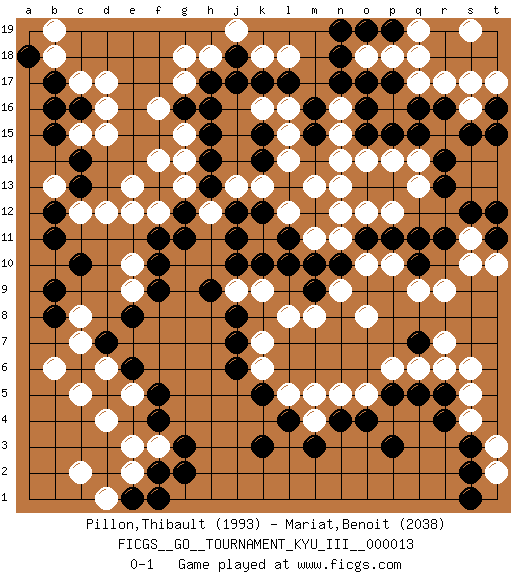 Last move : 0-1 2011 April 21 22:12:23 [Event "FICGS__GO__TOURNAMENT_KYU_III__000013"] [Site "FICGS"] [Date "2010.11.08"] [Round "1"] [Black "Pillon,Thibault"] [White "Mariat,Benoit"] [Result "0-1"] [Rating 1 "1993"] [Rating 2 "2038"] 1.q16 d4 2.r4 d16 3.p3 r9 4.r11 r6 5.c10 c8 6.c13 g17 7.b16 r17 8.r16 q17 9.p17 p18 10.o17 o18 11.n17 s16 12.s15 s17 13.r14 e3 14.q7 r7 15.k3 c17 16.g3 p10 17.p11 o10 18.q10 q9 19.o11 n11 20.c6 d6 21.j17 n12 22.n10 n9 23.m10 o8 24.j10 l12 25.l11 k11 26.k10 m11 27.l10 m13 28.h15 g15 29.h14 g14 30.k12 k13 31.j12 l15 32.k14 j13 33.h13 l14 34.k15 n15 35.o13 n13 36.m16 o14 37.m15 o12 38.p13 p12 39.q11 q13 40.r13 p14 41.p15 c5 42.k5 o5 43.p5 p6 44.q5 q6 45.o4 n5 46.n4 h18 47.b17 b18 48.c16 d17 49.d7 c7 50.e6 b6 51.e8 l8 52.j8 s4 53.s3 s5 54.f13 h12 55.j11 g13 56.g12 f12 57.g11 e13 58.f11 e12 59.f2 e2 60.f4 m5 61.b9 c12 62.b12 b13 63.c14 d12 64.b11 k7 65.j7 k6 66.j6 l5 67.l4 s11 68.s12 s10 69.e1 d1 70.f1 c2 71.a18 e10 72.f10 e9 73.f9 e5 74.f5 m4 75.m3 k18 76.j18 j19 77.k17 l18 78.n18 d15 79.o19 q19 80.n19 s19 81.r5 t3 82.s2 c15 83.b15 f3 84.g2 b19 85.h17 g18 86.t16 t17 87.t15 t2 88.m9 m8 89.g16 f16 90.h16 f14 91.s1 s6 92.p19 q18 93.b8 k9 94.t11 t10 95.t12 j9 96.h9 q14 97.q15 l16 98.o15 n16 99.o16 n14 100.l17 k16 0-1 Here are the names of the openings (joseki) played in the four corners : Corner d16 : d16 c13 Hoshi (Hwajeom, Seongjeom, Xingwei`) 4-4 Point. The star or hoshi (4-4) point, emphasizing influence at the potential expense of territory. Niken Kakari (Dukan Keolch'im, E`r Gua`jiao~, 2-Space Low Approach). White typically answers by 7-3 or 3-5 (which is not joseki). Player White won this Go (weiqi, baduk) game. Follow this game move after move (download)Everything would seem to be possible in Go. Like pulling a rabbit, by a magical move, out of a hat. (Pierre Audouard) Hardware: the parts of a computer that can be kicked. (Jeff Persis)