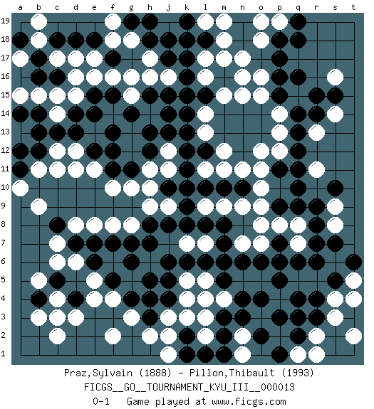 Last move : 0-1 2010 December 29 17:42:2 [Event "FICGS__GO__TOURNAMENT_KYU_III__000013"] [Site "FICGS"] [Date "2010.11.08"] [Round "1"] [Black "Praz,Sylvain"] [White "Pillon,Thibault"] [Result "0-1"] [Rating 1 "1888"] [Rating 2 "1993"] 1.q16 d17 2.r4 d3 3.p3 c6 4.q10 d15 5.k17 k3 6.q14 h17 7.m3 n17 8.p17 n15 9.m16 n16 10.k15 m15 11.h15 o12 12.q12 m12 13.k13 g16 14.k11 n9 15.k9 k5 16.c8 c11 17.c5 d6 18.c3 c2 19.d4 b3 20.b4 c4 21.m10 c3 22.n10 l14 23.k14 l16 24.k16 l17 25.m6 o10 26.p9 o9 27.p7 n11 28.c13 c14 29.d13 e11 30.f13 k7 31.h8 j12 32.k12 r11 33.q11 r13 34.r14 s9 35.r9 s8 36.s10 s14 37.s15 s4 38.s5 n7 39.n6 q8 40.r8 s3 41.r3 r2 42.q2 r5 43.r6 q5 44.s7 q3 45.q4 p4 46.q3 o3 47.p5 h6 48.f7 j9 49.j8 g8 50.g7 e8 51.h7 g10 52.k8 g13 53.g14 f14 54.f12 g12 55.f11 f10 56.e14 h14 57.f15 g15 58.h13 f14 59.g11 h11 60.g14 q1 61.o4 f14 62.e12 d11 63.g14 p2 64.q6 f14 65.b14 b15 66.g14 s16 67.r15 f14 68.c16 c15 69.g14 t2 70.h12 n2 71.h3 g5 72.k2 l3 73.m2 l2 74.l1 n1 75.n3 t4 76.o2 j2 77.p1 r1 78.f5 f4 79.k1 j1 80.m1 j3 81.g4 e5 82.h5 f6 83.j6 g3 84.h4 h2 85.g6 b5 86.b12 b11 87.d18 e17 88.b16 a15 89.c18 c17 90.b17 b18 91.a18 b19 92.e18 f18 93.f17 f16 94.e7 d8 95.d7 c7 96.a11 a10 97.a12 b9 98.j18 o18 99.h18 g18 100.p18 p19 101.q19 o19 102.q18 j11 103.j10 h9 104.e15 p13 105.q13 p8 106.k6 t5 107.t6 m9 108.l10 l7 109.m7 o7 110.l8 l5 111.l6 f8 112.a14 d16 113.l18 m18 114.f5 f2 115.e6 e4 116.l15 m17 117.m5 l19 118.k18 p14 119.k19 l13 120.o6 m19 121.g19 f19 122.h19 c12 123.b13 q7 124.q9 h16 125.j14 j16 126.p15 o15 127.p11 o11 128.l12 m11 129.r7 p6 130.k10 h10 131.p7 o8 132.j15 m4 133.n4 l4 134.j4 o16 135.p16 e16 136.m8 p12 137.p6 a17 138.d14 l9 139.j13 d12 140.j17 l11 141.j5 k4 0-1 Here are the names of the openings (joseki) played in the four corners : Player White won this Go (weiqi, baduk) game. Follow this game move after move (download)Fighting must not be the key to go, it should be reserved as your last resource. (Zhong-Pu Liu, about Weiqi) Follow your passion, and success will follow you. (Arthur Buddhold)