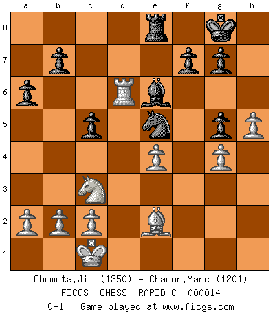 Last move : 0-1 2007 January 28 1:36:23 [Event "FICGS__CHESS__RAPID_C__000014"] [Site "FICGS"] [Date "2006.11.28"] [Round "1"] [White "Chometa,Jim"] [Black "Chacon,Marc"] [Result "0-1"] [WhiteElo "1350"] [BlackElo "1201"] 1.e4 c5 2.Nf3 d6 3.d4 cxd4 4.Nxd4 Nf6 5.Nc3 a6 6.f3 e5 7.Nb3 Be6 8.Be3 Nbd7 9.Qd2 Rc8 10.O-O-O Be7 11.g4 Nc5 12.Nxc5 dxc5 13.Qxd8+ Rxd8 14.Be2 Rxd1+ 15.Bxd1 O-O 16.h4 Nd7 17.Be2 Rd8 18.h5 h6 19.f4 exf4 20.Bxf4 Bg5 21.Bxg5 hxg5 22.Rd1 Re8 23.Rd6 Ne5 0-1 This chess game has been lost on time (started : 2006.11.28 9:38:32) Sicilian : Najdorf Queenside Castling by player White (move 10) Kingside Castling by player Black (move 15) Player Black won this chess game. Follow this game move after move (download)He who takes the Queen's Knight's Pawn will sleep in the streets. (Anonymous) Die Neutralität betrachte ich als eine schwere Krankheit. (Viktor Kortschnoi) Bobby solo arroja las piezas y solas caen en las casillas correctas. (Miguel Najdorf ) Mais l'homme est une créature légère et illogique : semblable au joueur d'échecs, il n'aime que le processus du but à atteindre, non le but lui-même. (Dostoïevsky) Big Chess is a place for big hallucinations. (Thibault de Vassal)