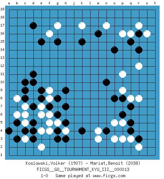 Last move : 1-0 2011 March 16 21:8:58 [Event "FICGS__GO__TOURNAMENT_KYU_III__000013"] [Site "FICGS"] [Date "2010.11.08"] [Round "1"] [Black "Koslowski,Volker"] [White "Mariat,Benoit"] [Result "1-0"] [Rating 1 "1907"] [Rating 2 "2038"] 1.d4 q16 2.d17 q3 3.q5 q8 4.n4 p5 5.p6 o5 6.q4 o3 7.r3 p3 8.p8 p9 9.o8 r8 10.q7 r2 11.n10 p11 12.r14 r12 13.r16 r17 14.q15 p16 15.o14 s16 16.d11 k17 17.k15 g17 18.g15 f16 19.k4 m3 20.m16 n17 21.g4 c6 22.c8 c3 23.e15 m4 24.c4 b4 25.b5 c5 26.b3 b6 27.a4 b8 28.c9 e6 29.g6 d8 30.d7 e7 31.g8 d9 32.c10 c7 33.e8 f8 34.e9 f9 35.d10 g7 36.h7 f6 37.h9 g5 38.f7 f4 39.h5 e4 40.d3 f5 41.d5 h4 42.g3 e2 43.h3 1-0 Here are the names of the openings (joseki) played in the four corners : Corner q4 : q3 q5 Komoku (Somok, Xiao~mu`) 3-4 Point. The komoku (3-4) point is the traditional corner enclosure move.. Ikken Takagakari (Hankan Nop'dakeolch'im, Yi Gaogua`jiao~, 1-Space High Approach). The 5-4 approach move has become more popular in modern times, as modern Go emphasizes speed and influence. Player Black won this Go (weiqi, baduk) game. Follow this game move after move (download)The simplest move is the best move. (Anonymous) An expert is a man who has made all the mistakes which can be made in a very narrow field. (Niels Bohr)