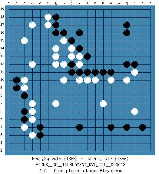Last move : 1-0 2011 January 17 23:17:3 [Event "FICGS__GO__TOURNAMENT_KYU_III__000013"] [Site "FICGS"] [Date "2010.11.08"] [Round "1"] [Black "Praz,Sylvain"] [White "Lubeck,Kate"] [Result "1-0"] [Rating 1 "1888"] [Rating 2 "1656"] 1.q16 c4 2.q4 d17 3.e4 d3 4.e3 d6 5.k4 d12 6.g16 c15 7.k16 q10 8.r12 r11 9.q12 r6 10.o4 k10 11.s4 g7 12.q17 n7 13.l11 l10 14.n11 m10 15.m11 o10 16.o11 f18 17.g18 f17 18.g17 g12 19.h13 j14 20.h14 j13 21.j12 h12 22.j11 h15 23.j15 g14 24.k14 k13 25.l13 k12 26.k11 g13 27.h16 h10 28.c8 c10 29.c5 d5 30.c6 d7 31.b9 c9 32.b10 1-0 This go game has been lost on time (started : 2010.11.08 4:43:14) Here are the names of the openings (joseki) played in the four corners : Corner d4 : c4 e4 Komoku (Somok, Xiao~mu`) 3-4 Point. The komoku (3-4) point is the traditional corner enclosure move.. Ikken Takagakari (Hankan Nop'dakeolch'im, Yi Gaogua`jiao~, 1-Space High Approach). The 5-4 approach move has become more popular in modern times, as modern Go emphasizes speed and influence. Corner q4 : q4 r6 Hoshi (Hwajeom, Seongjeom, Xingwei`) 4-4 Point. The star or hoshi (4-4) point, emphasizing influence at the potential expense of territory. Ikken Kakari (Hankan Keolch'im, Yi Gua`jiao~, 1-Space Low Approach). White 2 is the standard approach move to the 4-4. Player Black won this Go (weiqi, baduk) game. Follow this game move after move (download)If you have won four corners, resign. (Anonymous) Methinks King Thibault should dub Marius Zubac a knight of the square board... I mean table, henceforth addressing him as Sir Marius, and bestow on him a suitable land from the kingdom of FICGS & marry him off to a worthy, fair maiden, lest he slice our heads with his mighty sword in his wrath. (Dinesh De Silva)