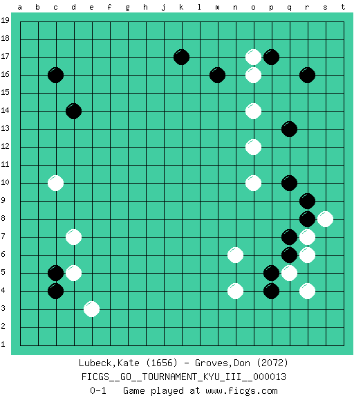 Last move : 0-1 2010 December 28 22:56:10 [Event "FICGS__GO__TOURNAMENT_KYU_III__000013 "] [Site "FICGS"] [Date "2010.11.08"] [Round "1"] [Black "Lubeck,Kate "] [White "Groves,Don "] [Result "0-1"] [Rating 1 "1656"] [Rating 2 "2072"] 1.r16 e3 2.c16 r4 3.k17 o16 4.p17 o17 5.m16 o14 6.q13 o12 7.q10 o10 8.p4 n4 9.q6 q5 10.p5 r6 11.q7 r7 12.r8 s8 13.r9 c10 14.c4 d5 15.c5 d7 16.d14 n6 0-1 This go game has been lost on time (started : 2010.11.08 4:43:14) Here are the names of the openings (joseki) played in the four corners : Corner q16 : r16 o16Komoku (Somok, Xiao~mu`) 3-4 Point. The komoku (3-4) point is the traditional corner enclosure move..Niken Takagakari (Dukan Nop'dakeolch'im, E`r Gaojia, 2-Space High Approch). The great master Honinbo Shuei (1852-1906) favored the two-space high (niken taka-gakari) approach, especially in two stone handicap games. This approach move was very popular in the 1910s. Wu Qingyuan = Go Seigen frequently played this way, considering it a good "whole board" approach. In recent years, O Rissei has often used the two-space high approach. Corner q4 : r4 p4Komoku (Somok, Xiao~mu`) 3-4 Point. The komoku (3-4) point is the traditional corner enclosure move..Ikken Takagakari (Hankan Nop'dakeolch'im, Yi Gaogua`jiao~, 1-Space High Approach). The 5-4 approach move has become more popular in modern times, as modern Go emphasizes speed and influence. Corner d4 : e3 c4Mokuhazushi (Waemok, Wai`mu`) 5-3 Point. The mokuhazushi (5-3) point was popular in the Edo period in Japan (1600 - 1867). It emphasizes influence; territorially, it is inferior to the 3-4 point.Komoku Kakari. Black 2 is the standard approach because of its solidity and stability. Player White won this Go (weiqi, baduk) game.Follow this game move after move (download ) A knight's move near the edge of the board cannot be cut. (Bill Taylor) If you don't practice you don't deserve to win. (Andre Agassi)