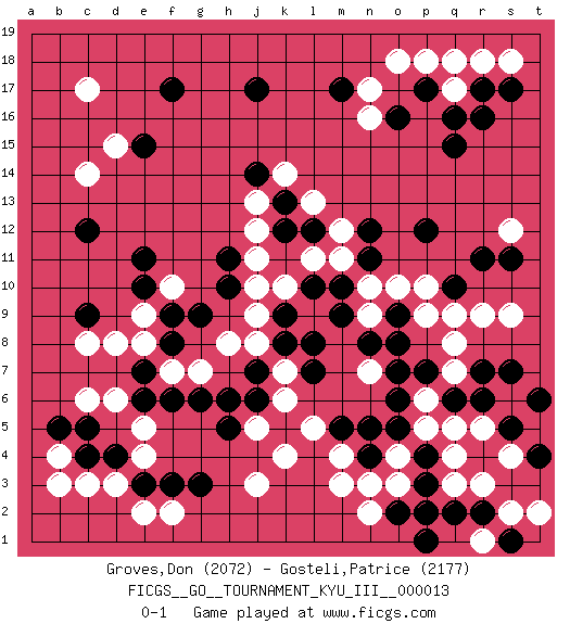 Last move : 0-1 2010 December 19 0:51:7 [Event "FICGS__GO__TOURNAMENT_KYU_III__000013"] [Site "FICGS"] [Date "2010.11.08"] [Round "1"] [Black "Groves,Don"] [White "Gosteli,Patrice"] [Result "0-1"] [Rating 1 "2072"] [Rating 2 "2177"] 1.q15 r5 2.d4 c17 3.j17 q17 4.o16 o18 5.r17 r18 6.r16 s18 7.p17 p18 8.s17 n16 9.m17 n17 10.f17 c14 11.r11 c6 12.q16 q18 13.e6 c3 14.c4 d3 15.e3 b4 16.b5 b3 17.c5 e2 18.f3 f2 19.g3 r9 20.p4 p5 21.o5 p6 22.o6 o4 23.n4 o3 24.p3 p2 25.o2 n3 26.q2 n2 27.p1 m4 28.n5 j3 29.m5 m3 30.k5 r3 31.r2 s2 32.p7 q3 33.q6 q5 34.r6 s6 35.s7 q7 36.r7 q8 37.s5 s4 38.t6 s9 39.o9 p9 40.o8 p10 41.p12 o10 42.m10 n10 43.m9 s12 44.s11 k4 45.h5 j5 46.j6 l5 47.n12 k6 48.l7 n7 49.o7 m11 50.n11 l11 51.c9 n9 52.n8 k7 53.l8 k10 54.k8 j8 55.k9 j9 56.l10 j11 57.c12 e9 58.e10 c8 59.f9 d8 60.f8 f10 61.e11 d6 62.j7 e5 63.f6 e4 64.h10 j10 65.h11 g7 66.g6 h8 67.h6 f7 68.e7 e8 69.g9 j13 70.k12 j12 71.s1 t2 72.t4 q4 73.p2 r1 74.q10 q9 75.e15 d15 76.k13 k14 77.j14 l13 78.l12 m12 0-1 Here are the names of the openings (joseki) played in the four corners : Corner d16 : c17 j17 San-San (Sam-Sam, San-San) 3-3 Point. The San-San (3-3) point, emphasizing territory at the expense of influence. Corner q16 : q15 q17 Takamoku (Gomok, Gaomu`) 5-4 Point. The takamoku (high) point (5-4). With its emphasis on influence, the 5-4 point complements the 4-4 (hoshi) point in creating an influence-oriented fuseki. Komoku. Black responds with 3-3, 3-5, 4-6, 4-7, 3-6, 3-7. Corner d4 : d4 c6 Hoshi (Hwajeom, Seongjeom, Xingwei`) 4-4 Point. The star or hoshi (4-4) point, emphasizing influence at the potential expense of territory. Ikken Kakari (Hankan Keolch'im, Yi Gua`jiao~, 1-Space Low Approach). White 2 is the standard approach move to the 4-4. Player White won this Go (weiqi, baduk) game. Follow this game move after move (download)The carpenter's square becomes ko. (Anonymous) Secret operations are essential in war; upon them the army relies to make its every move. (Sun Tzu)