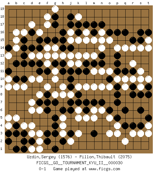 Last move : 0-1 2010 December 18 12:4:36 [Event "FICGS__GO__TOURNAMENT_KYU_II__000030"] [Site "FICGS"] [Date "2010.11.08"] [Round "1"] [Black "Uzdin,Sergey"] [White "Pillon,Thibault"] [Result "0-1"] [Rating 1 "1576"] [Rating 2 "2075"] 1.q16 d4 2.q4 d17 3.c15 d10 4.f3 d6 5.c3 d3 6.d2 c4 7.b3 e2 8.c1 e3 9.b4 b5 10.g17 e16 11.k16 c16 12.c12 o3 13.m3 o5 14.q6 q2 15.j3 d15 16.c14 r14 17.r15 q14 18.o16 r10 19.r8 r3 20.r4 s3 21.s4 p10 22.s15 b16 23.e12 e1 24.a2 h3 25.h2 g2 26.g3 h4 27.f2 j2 28.g1 k3 29.g4 h5 30.f6 e8 31.g7 g8 32.h6 h8 33.j6 k5 34.g5 k6 35.j7 k9 36.e7 d7 37.k7 m15 38.m16 o15 39.l7 m5 40.r9 m9 41.n7 n16 42.n17 n15 43.p16 l16 44.m17 k15 45.l17 l15 46.l6 l5 47.p7 j16 48.g15 d13 49.c13 f14 50.d12 g14 51.c10 c9 52.b10 b9 53.g12 j12 54.j18 k18 55.k17 f18 56.h16 s14 57.h14 h13 58.j14 j15 59.h15 l13 60.j17 a13 61.b12 t15 62.t16 t14 63.s16 t4 64.t5 t3 65.s6 s10 66.o10 o9 67.p9 q9 68.p8 n9 69.j9 j8 70.f8 f9 71.k8 l9 72.g9 h9 73.j10 g10 74.h11 e10 75.a14 b14 76.d14 e13 77.e14 f13 78.f15 g13 79.e15 f12 80.k11 k12 81.l11 m11 82.m12 n11 83.l12 m13 84.n12 o11 85.f11 g11 86.h12 j13 87.j11 k13 88.n13 p3 89.p13 p14 90.p12 r12 91.q11 q10 92.r11 s11 93.e11 p4 94.p5 s9 95.s8 e6 96.f7 f17 97.g18 a4 98.b1 a10 99.a11 a9 100.a3 a5 101.p11 n14 102.t9 t10 103.t8 d1 104.c2 b15 105.d16 n6 106.o6 m6 107.m7 g19 0-1 Here are the names of the openings (joseki) played in the four corners : Corner d16 : d17 c15 Komoku (Somok, Xiao~mu`) 3-4 Point. The komoku (3-4) point is the traditional corner enclosure move.. Ikken Kakari (Hankan Keolch'im, Yi Gua`jiao~, 1-Space Low Pincer). The small knight move is the basic approach move to the 3-4 point stone. It has been continually used for over four centuries. There are limitless variations, with new moves constantly being discovered. Black 2 opens the door to a treaure store of joseki. Corner d4 : d4 f3 Hoshi (Hwajeom, Seongjeom, Xingwei`) 4-4 Point. The star or hoshi (4-4) point, emphasizing influence at the potential expense of territory. Ikken Kakari (Hankan Keolch'im, Yi Gua`jiao~, 1-Space Low Approach). Black 2 is the standard approach move to the 4-4. Corner q4 : q4 o3 Hoshi (Hwajeom, Seongjeom, Xingwei`) 4-4 Point. The star or hoshi (4-4) point, emphasizing influence at the potential expense of territory. Ikken Kakari (Hankan Keolch'im, Yi Gua`jiao~, 1-Space Low Approach). White 2 is the standard approach move to the 4-4. Corner q16 : q16 r14 Hoshi (Hwajeom, Seongjeom, Xingwei`) 4-4 Point. The star or hoshi (4-4) point, emphasizing influence at the potential expense of territory. Ikken Kakari (Hankan Keolch'im, Yi Gua`jiao~, 1-Space Low Approach). White 2 is the standard approach move to the 4-4. Player White won this Go (weiqi, baduk) game. Follow this game move after move (download)Don't reduce your own liberties. (Bill Taylor) The greatest con, that he ever pulled... was making you believe... that he is you. (Revolver, movie)