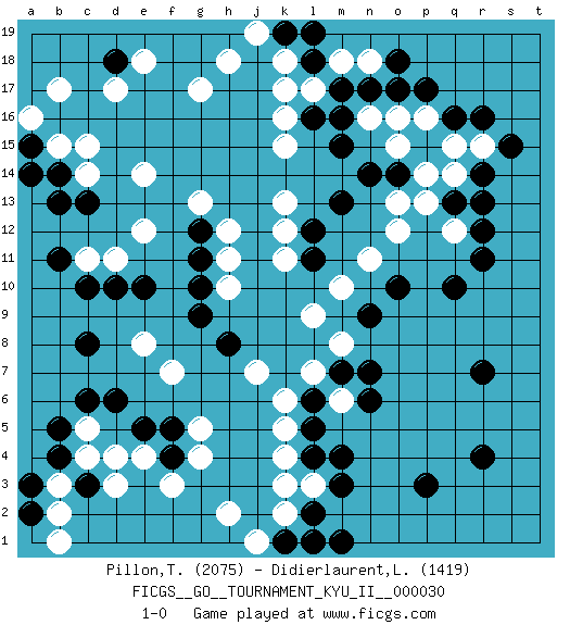 Last move : 1-0 2010 December 21 13:5:36 [Event "FICGS__GO__TOURNAMENT_KYU_II__000030"] [Site "FICGS"] [Date "2010.11.08"] [Round "1"] [Black "Pillon,Thibault"] [White "Didierlaurent,Ludovic"] [Result "1-0"] [Rating 1 "2075"] [Rating 2 "1419"] 1.q16 d17 2.r4 d4 3.p3 c15 4.q10 p16 5.p17 o16 6.o17 n16 7.n17 q15 8.r16 k4 9.c6 c5 10.d6 g4 11.c10 f7 12.c13 g17 13.m16 p14 14.m3 q12 15.r7 k17 16.m15 j7 17.c3 d3 18.b5 c4 19.b4 b3 20.r14 r15 21.r12 o12 22.r11 l3 23.s15 k15 24.o14 o13 25.n14 n11 26.e10 e14 27.d18 e18 28.m4 k13 29.l2 k2 30.l4 k3 31.n9 l7 32.n7 e12 33.b14 b15 34.a15 a16 35.a14 b17 36.l11 m10 37.g11 g13 38.g9 c14 39.b13 l9 40.a3 b2 41.a2 b1 42.l18 k18 43.k19 j19 44.l19 h18 45.p15 q14 46.q13 p13 47.r13 o15 48.m1 l17 49.m17 m18 50.k1 j1 51.l1 h2 52.e5 e4 53.f5 g5 54.o10 k11 55.m13 d11 56.d10 c11 57.b11 n18 58.o18 e8 59.c8 m6 60.n6 h10 61.g10 h11 62.l12 k12 63.l5 k5 64.l6 k6 65.m7 m8 66.f4 f3 67.l16 k16 68.g12 h12 69.h8 1-0 Here are the names of the openings (joseki) played in the four corners : Corner q16 : q16 p16 Hoshi (Hwajeom, Seongjeom, Xingwei`) 4-4 Point. The star or hoshi (4-4) point, emphasizing influence at the potential expense of territory. Corner d4 : d4 c6 Hoshi (Hwajeom, Seongjeom, Xingwei`) 4-4 Point. The star or hoshi (4-4) point, emphasizing influence at the potential expense of territory. Ikken Kakari (Hankan Keolch'im, Yi Gua`jiao~, 1-Space Low Approach). Black 2 is the standard approach move to the 4-4. Player Black won this Go (weiqi, baduk) game. Follow this game move after move (download)To reduce an opponent's large prospective territory, strike at the shoulder. (Anonymous) I'm extremely disappointed. I send you out for exciting, new designer drugs, you come back with tomato sauce. (Gregory House, House M.D.)