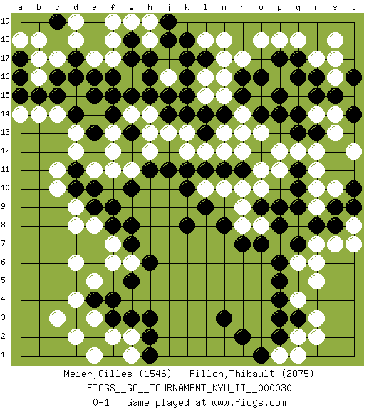 Last move : 0-1 2010 November 30 23:56:10 [Event "FICGS__GO__TOURNAMENT_KYU_II__000030"] [Site "FICGS"] [Date "2010.11.08"] [Round "1"] [Black "Meier,Gilles"] [White "Pillon,Thibault"] [Result "0-1"] [Rating 1 "1546"] [Rating 2 "2075"] 1.q16 d4 2.d16 r5 3.p3 r3 4.m3 c14 5.f16 c11 6.f3 d6 7.g5 r14 8.o16 m17 9.k17 m15 10.k15 r17 11.r16 s16 12.s15 s18 13.r15 o18 14.p17 p18 15.q17 q18 16.p14 r11 17.p5 s14 18.q14 c17 19.c16 b16 20.b15 b18 21.c15 f18 22.g17 d2 23.g7 p11 24.q7 r7 25.r8 r6 26.p8 n10 27.m8 l10 28.k8 g1 29.h2 e14 30.f9 d9 31.p15 e17 32.d17 d18 33.e16 g14 34.g15 h14 35.h15 q2 36.p2 p1 37.o1 q1 38.n2 b14 39.a16 b17 40.e2 e1 41.d3 c3 42.e4 e3 43.r13 f2 44.g3 f11 45.g10 s13 46.t16 r12 47.q13 s17 48.s8 s7 49.h1 g11 50.k10 m12 51.l9 l18 52.k18 h18 53.h17 k13 54.l11 m10 55.j11 n12 56.g18 j16 57.h16 g19 58.j18 h19 59.j15 f17 60.f15 e5 61.f4 k12 62.k11 s10 63.q3 r2 64.c19 d19 65.e10 e11 66.d10 c10 67.h11 e8 68.f8 q4 69.p4 n8 70.n7 o8 71.o7 h12 72.e9 d8 73.o9 n9 74.q9 o10 75.q11 q12 76.q10 p12 77.p9 f6 78.t14 t12 79.d11 d12 80.j19 f19 81.l17 m18 82.f14 f13 83.j14 g6 84.h6 l16 85.k16 g2 86.h3 a14 87.a15 q6 88.p6 j13 89.g13 h13 90.e13 f12 91.d14 d13 92.e15 f7 93.g8 o13 94.l14 m13 95.m14 n17 96.a17 a18 97.m11 n14 98.n11 o11 99.n16 l15 100.n15 m16 101.o14 n13 102.l13 l12 103.k14 t8 104.t9 t7 105.s9 r10 106.t10 r9 0-1 Here are the names of the openings (joseki) played in the four corners : Corner q4 : r5 p3 Mokuhazushi (Waemok, Wai`mu`) 5-3 Point. The mokuhazushi (5-3) point was popular in the Edo period in Japan (1600 - 1867). It emphasizes influence; territorially, it is inferior to the 3-4 point. Corner d16 : d16 c14 Hoshi (Hwajeom, Seongjeom, Xingwei`) 4-4 Point. The star or hoshi (4-4) point, emphasizing influence at the potential expense of territory. Ikken Kakari (Hankan Keolch'im, Yi Gua`jiao~, 1-Space Low Approach). White 2 is the standard approach move to the 4-4. Corner d4 : d4 f3 Hoshi (Hwajeom, Seongjeom, Xingwei`) 4-4 Point. The star or hoshi (4-4) point, emphasizing influence at the potential expense of territory. Ikken Kakari (Hankan Keolch'im, Yi Gua`jiao~, 1-Space Low Approach). Black 2 is the standard approach move to the 4-4. Corner q16 : q16 r14 Hoshi (Hwajeom, Seongjeom, Xingwei`) 4-4 Point. The star or hoshi (4-4) point, emphasizing influence at the potential expense of territory. Ikken Kakari (Hankan Keolch'im, Yi Gua`jiao~, 1-Space Low Approach). White 2 is the standard approach move to the 4-4. Player White won this Go (weiqi, baduk) game. Follow this game move after move (download)There is death in the hane. (Anonymous) There is a very easy way to return from a casino with a small fortune : go there with a large one. (Jack Yelton)