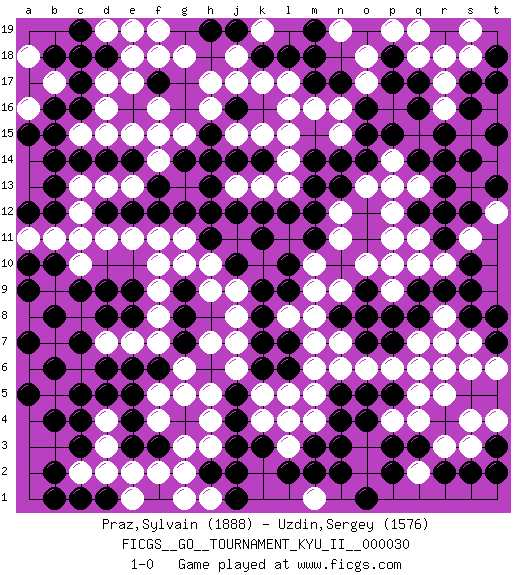 Last move : 1-0 2011 January 14 10:18:59 [Event "FICGS__GO__TOURNAMENT_KYU_II__000030"] [Site "FICGS"] [Date "2010.11.08"] [Round "1"] [Black "Praz,Sylvain"] [White "Uzdin,Sergey"] [Result "1-0"] [Rating 1 "1888"] [Rating 2 "1576"] 1.q16 d4 2.r4 p4 3.n3 r3 4.q3 q4 5.p3 o3 6.o4 o2 7.r2 s3 8.p2 r5 9.n2 d16 10.f17 h17 11.c17 d17 12.c16 d15 13.d18 e18 14.c18 e17 15.c14 o17 16.r14 q18 17.m17 r17 18.p17 r16 19.o16 k17 20.r11 r8 21.f3 h3 22.c3 d3 23.c4 c2 24.b2 d2 25.c5 f4 26.d5 l3 27.d9 c11 28.c9 e11 29.d14 f16 30.f13 g11 31.g9 e13 32.e14 f14 33.e12 d13 34.d12 c13 35.b13 c12 36.f12 d11 37.g14 f15 38.h12 f11 39.h13 h10 40.j16 j17 41.k11 l16 42.k9 h9 43.g8 j8 44.l7 j6 45.j4 h4 46.k3 l5 47.l2 k4 48.j3 h5 49.j5 h7 50.k6 m6 51.o5 n7 52.q8 q7 53.p7 o8 54.p8 m9 55.l9 m10 56.m12 o10 57.r9 m4 58.m3 p11 59.r7 s7 60.s8 s6 61.s2 s4 62.p18 n12 63.m14 p13 64.q12 p12 65.l18 j15 66.r15 s15 67.s14 t16 68.h11 g10 69.n13 n11 70.h19 g18 71.b10 e7 72.e8 d7 73.f6 f7 74.g7 g6 75.e6 f2 76.b12 q6 77.b1 b7 78.c7 c6 79.d6 c8 80.d8 b5 81.b4 b9 82.a9 a8 83.b8 q2 84.o1 b9 85.a5 b11 86.b8 c15 87.b15 b9 88.a10 c10 89.b8 f8 90.c7 f9 91.b6 a11 92.a7 k13 93.k12 l13 94.m13 n15 95.o14 n16 96.n17 q13 97.r13 k5 98.o15 l15 99.m11 o13 100.n14 p9 101.l6 p19 102.o19 q19 103.t3 t4 104.t2 p6 105.o7 o6 106.n8 m8 107.o9 n9 108.o8 l8 109.k8 m7 110.k7 m5 111.q9 q11 112.r12 q10 113.h2 g2 114.j2 r10 115.s10 p10 116.e19 f18 117.h15 h16 118.n5 n6 119.c1 l17 120.k18 h1 121.j1 g1 122.q17 s18 123.j14 k15 124.d1 e1 125.e4 e2 126.g4 f5 127.e5 g5 128.e3 g3 129.a12 g15 130.h14 a18 131.a17 b17 132.b18 a16 133.b16 l4 134.p5 q5 135.t7 t6 136.t8 r6 137.s9 r8 138.j10 j9 139.l10 t14 140.t13 t12 141.t15 o18 142.s16 n19 143.s17 r18 144.m19 m16 145.m18 j18 146.t18 k19 147.j19 s19 148.t17 d19 149.c19 f19 150.e9 f10 151.n4 d19 152.g12 e19 153.l12 r7 154.q14 s11 155.s12 j7 156.a15 p14 157.p15 j13 158.k14 l14 159.j12 e15 160.b14 m1 161.m2 1-0 Here are the names of the openings (joseki) played in the four corners : Corner q4 : r4 p4 Komoku (Somok, Xiao~mu`) 3-4 Point. The komoku (3-4) point is the traditional corner enclosure move.. Ikken Takagakari (Hankan Nop'dakeolch'im, Yi Gaogua`jiao~, 1-Space High Approach). The 5-4 approach move has become more popular in modern times, as modern Go emphasizes speed and influence. Corner d16 : d16 f17 Hoshi (Hwajeom, Seongjeom, Xingwei`) 4-4 Point. The star or hoshi (4-4) point, emphasizing influence at the potential expense of territory. Ikken Kakari (Hankan Keolch'im, Yi Gua`jiao~, 1-Space Low Approach). Black 2 is the standard approach move to the 4-4. Corner q16 : q16 o17 Hoshi (Hwajeom, Seongjeom, Xingwei`) 4-4 Point. The star or hoshi (4-4) point, emphasizing influence at the potential expense of territory. Ikken Kakari (Hankan Keolch'im, Yi Gua`jiao~, 1-Space Low Approach). White 2 is the standard approach move to the 4-4. Corner d4 : d4 f3 Hoshi (Hwajeom, Seongjeom, Xingwei`) 4-4 Point. The star or hoshi (4-4) point, emphasizing influence at the potential expense of territory. Ikken Kakari (Hankan Keolch'im, Yi Gua`jiao~, 1-Space Low Approach). Black 2 is the standard approach move to the 4-4. Player Black won this Go (weiqi, baduk) game. Follow this game move after move (download)Don't make a play adjacent to a cutting-point. (Anonymous) A good aphorism is too hard for the tooth of time, and is not worn away with the centuries, although it serves as food for every speech. (Friedrich Nietzsche)