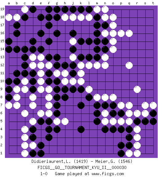 Last move : 1-0 2010 December 18 23:19:23 [Event "FICGS__GO__TOURNAMENT_KYU_II__000030"] [Site "FICGS"] [Date "2010.11.08"] [Round "1"] [Black "Didierlaurent,Ludovic"] [White "Meier,Gilles"] [Result "1-0"] [Rating 1 "1419"] [Rating 2 "1546"] 1.q3 d16 2.r5 q16 3.d4 c6 4.d10 c9 5.d9 c10 6.c11 d8 7.e8 d7 8.e7 e6 9.g4 f6 10.h8 e9 11.d11 f9 12.f17 d17 13.d14 c15 14.c14 b15 15.j16 r9 16.k4 q12 17.m16 o17 18.n17 n18 19.m18 n16 20.m17 o18 21.n15 o15 22.o16 p16 23.n4 c3 24.d3 c4 25.g7 f7 26.n14 o14 27.k7 n13 28.m13 m12 29.l13 n12 30.f15 l12 31.k13 s6 32.s5 r6 33.n7 q5 34.q4 p5 35.p4 o8 36.g12 n8 37.m7 m8 38.l8 l9 39.t6 t7 40.t5 s7 41.k9 k10 42.j9 k11 43.g8 f8 44.f4 h5 45.g6 o5 46.o4 e15 47.e14 f16 48.g16 e17 49.e16 f18 50.g18 e19 51.d15 d2 52.e2 c1 53.b14 g19 54.h19 h18 55.f19 r4 56.e18 d18 57.d19 c19 58.b17 b18 59.a15 c16 60.b16 e19 61.f18 c17 62.d19 g5 63.f5 e19 64.a14 a18 65.d19 r3 66.c18 r2 67.q2 q1 68.p1 r1 69.p2 m19 70.l19 n19 71.e1 l18 72.k19 k18 73.j19 j18 74.g19 j13 75.j12 k12 76.j11 k14 77.l15 j10 78.b10 b9 79.b11 n6 80.m6 n5 81.m5 l14 82.m14 n16 83.m15 f12 84.f11 g11 85.g10 h11 86.h12 h10 87.f13 e12 88.g13 e11 89.f10 e10 90.o7 p7 91.a9 b8 92.a8 a7 93.a10 b7 94.p6 q7 95.o6 q6 96.d1 c2 97.g9 e3 98.f3 e4 99.e5 d12 100.c12 d13 101.c13 d5 102.h9 j15 103.k15 e13 104.j14 o16 105.pass 1-0 Here are the names of the openings (joseki) played in the four corners : Corner d4 : d4 c6 Hoshi (Hwajeom, Seongjeom, Xingwei`) 4-4 Point. The star or hoshi (4-4) point, emphasizing influence at the potential expense of territory. Ikken Kakari (Hankan Keolch'im, Yi Gua`jiao~, 1-Space Low Approach). White 2 is the standard approach move to the 4-4. Corner d16 : d16 c11 Hoshi (Hwajeom, Seongjeom, Xingwei`) 4-4 Point. The star or hoshi (4-4) point, emphasizing influence at the potential expense of territory. Player Black won this Go (weiqi, baduk) game. Follow this game move after move (download)Don't defend - extend ! (Bill Taylor) Have no fear of perfection - you'll never reach it. (Salvador Dali)