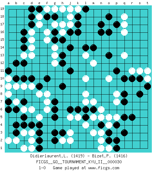 Last move : 1-0 2011 March 22 9:40:4 [Event "FICGS__GO__TOURNAMENT_KYU_II__000030"] [Site "FICGS"] [Date "2010.11.08"] [Round "1"] [Black "Didierlaurent,Ludovic"] [White "Bizet,Patrick"] [Result "1-0"] [Rating 1 "1419"] [Rating 2 "1416"] 1.q3 q16 2.r5 d16 3.d4 m3 4.k16 j3 5.g3 c6 6.c5 d6 7.d10 c9 8.c10 d9 9.c14 d14 10.c15 d15 11.c16 d13 12.c12 h16 13.d17 e17 14.d18 e18 15.n16 o17 16.n17 q13 17.q10 r11 18.r10 s11 19.s10 j17 20.k17 p8 21.q8 p7 22.q7 p5 23.f10 f8 24.g6 f6 25.g5 j5 26.m6 l8 27.n4 n5 28.j6 m5 29.k6 k5 30.o18 o4 31.h9 e5 32.e4 l7 33.l6 l10 34.p17 q17 35.o16 o10 36.o3 n3 37.p4 o5 38.o2 n2 39.j14 g14 40.o13 m12 41.m14 h2 42.g2 m7 43.p11 t10 44.t9 t11 45.s8 c3 46.c4 d3 47.b3 b2 48.b4 a2 49.e3 d2 50.e2 c1 51.e1 d1 52.e19 f19 53.d19 j18 54.k18 k19 55.l19 j19 56.l5 l4 57.h3 j2 58.j11 g12 59.h13 g13 60.h12 b9 61.b10 a10 62.a11 a9 63.b12 q18 64.g7 f7 65.e9 e8 66.q5 o1 67.p1 n1 68.p2 l13 69.l14 n6 70.f18 g19 71.g18 h19 72.g16 f16 73.j16 h17 74.h15 g17 75.g15 f15 76.b6 b7 77.a7 a8 78.a6 c13 79.c7 1-0 Here are the names of the openings (joseki) played in the four corners : Corner d4 : d4 j3 Hoshi (Hwajeom, Seongjeom, Xingwei`) 4-4 Point. The star or hoshi (4-4) point, emphasizing influence at the potential expense of territory. Corner d16 : d16 c14 Hoshi (Hwajeom, Seongjeom, Xingwei`) 4-4 Point. The star or hoshi (4-4) point, emphasizing influence at the potential expense of territory. Ikken Kakari (Hankan Keolch'im, Yi Gua`jiao~, 1-Space Low Approach). Black 2 is the standard approach move to the 4-4. Corner q16 : q16 n16 Hoshi (Hwajeom, Seongjeom, Xingwei`) 4-4 Point. The star or hoshi (4-4) point, emphasizing influence at the potential expense of territory. Niken Takagakari (Dukan Nop'dakeolch'im, E`r Gaojia, 2-Space High Approach). Black 2 is a light approach move. Rarely played in even games, Black 2 is typically employed in handicap games. White continues with 6-4 or 3-10. In Korean Sunjang Baduk White has a stone on 8-4. Player Black won this Go (weiqi, baduk) game. Follow this game move after move (download)If a formation is symmetrical, play at the center. (Anonymous) If I had no sense of humor, I would long ago have committed suicide. (Mahatma Gandhi)