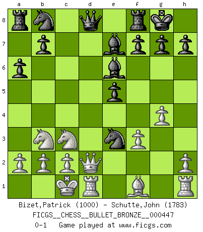 Last move : 0-1 2010 November 8 16:25:1 [Event "FICGS__CHESS__BULLET_BRONZE__000447"] [Site "FICGS"] [Date "2010.11.08"] [Round "1"] [White "Bizet,Patrick"] [Black "Schutte,John"] [Result "0-1"] [WhiteElo "1000"] [BlackElo "1783"] 1.e4 c5 2.Nf3 d6 3.d4 cxd4 4.Nxd4 Nf6 5.Nc3 a6 6.Be3 e5 7.Nb3 Be6 8.f3 Be7 9.Qd2 O-O 10.g4 d5 11.exd5 Nxd5 12.O-O-O Nxe3 0-1 Sicilian : Najdorf, Byrne (English) attack Kingside Castling by player Black (move 9) Queenside Castling by player White (move 12) Player Black won this chess game. Follow this game move after move (download)The stomach is an essential part of the Chess master. (Bent Larsen) Kein Großmeister ist normal. Sie unterscheiden sich nur im Ausmaß Ihrer Verrücktheit. (Viktor Kortschnoi) Tu sabes que vas a perder. Aún cuando tenía la ventaja, yo sabía que iba a perder. - al estar jugando con Fischer (Andrew Soltis) Les écrivains ont utilisé les échecs pour analyser les côtés extrêmes de la nature humaine. Dans ce cadre, les échecs offrent un champ d'expérimentation idéal. Mais on pourrait faire la même chose avec la peinture. Et là, en vous référant à Van Gogh, vous ne tirerez pas de conclusion définitive sur les peintres. (Gary Kasparov) At last I discovered the true beauty of chess. So I proposed to her. (Dinesh De Silva)