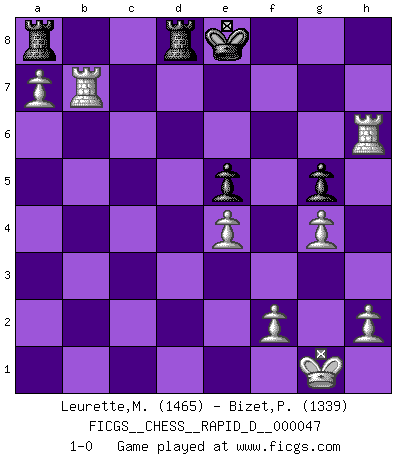 Last move : 1-0 2010 December 21 0:30:33 [Event "FICGS__CHESS__RAPID_D__000047"] [Site "FICGS"] [Date "2010.11.08"] [Round "1"] [White "Leurette,Marc-Antoine"] [Black "Bizet,Patrick"] [Result "1-0"] [WhiteElo "1465"] [BlackElo "1339"] 1.e4 c5 2.Nf3 d6 3.Bb5+ Nd7 4.d4 cxd4 5.Qxd4 a6 6.Bxd7+ Bxd7 7.Nc3 e5 8.Qd3 Be7 9.O-O h6 10.Be3 b5 11.b4 Qc7 12.Nd5 Qb7 13.Nb6 Rd8 14.Nxd7 Rxd7 15.a4 Nf6 16.axb5 Qxb5 17.Rab1 Qxd3 18.cxd3 Bd8 19.Ra1 a5 20.bxa5 Rb7 21.a6 Rb8 22.Rfb1 Ra8 23.a7 Bc7 24.Rb7 Kd7 25.Rc1 Rhc8 26.Bb6 Ne8 27.d4 f6 28.dxe5 fxe5 29.Ba5 Kd8 30.Bb4 g5 31.Nxe5 dxe5 32.Rd1+ Nd6 33.Bxd6 Bxd6 34.Rxd6+ Ke8 35.g4 Rd8 36.Rxh6 1-0 Sicilian : Canal-Sokolsky (Nimzovich-Rossolimo, Moscow) attack Kingside Castling by player White (move 9) Player White won this chess game. Follow this game move after move (download)Many Chess players were surprised when after the game, Fischer quietly explained: 'I had already analyzed this possibility' in a position which I thought was not possible to foresee from the opening. (Mikhail Tal) Kombinieren und Schwarzhandel gehören verboten. (Savielly Grigorievitsch Tartakower) Una compensación adecuada por un sacrificio es tener una combinación sólida que conduce a una posición ganadora; una compensación adecuada por una metida de pata es dejar a tu oponente arrebatar una derrota de las fauces de la victoria. (Bruce A. Moon) Le profane ne songe pas à la somme de jouissance dont il se prive, qui méconnaît ce jeu aux ressources aussi variées que passionnantes. (Jean-Marie Jeanton-Lamarche) Players are not good because they find tactics, it is about the way to find the positions in which those tactics are hidden. (Luc-Olivier Leclerc)