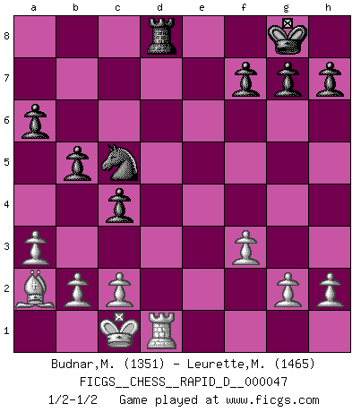 Last move : 1/2-1/2 2010 November 25 17:5:59 [Event "FICGS__CHESS__RAPID_D__000047"] [Site "FICGS"] [Date "2010.11.08"] [Round "1"] [White "Budnar,Milos"] [Black "Leurette,Marc-Antoine"] [Result "1/2-1/2"] [WhiteElo "1351"] [BlackElo "1465"] 1.e4 e5 2.Nf3 Nc6 3.d4 exd4 4.Nxd4 Nf6 5.Nc3 Bc5 6.Be3 Bxd4 7.Bxd4 O-O 8.Bb5 Nxd4 9.Qxd4 d6 10.O-O-O a6 11.Bc4 b5 12.Bb3 Bb7 13.a3 c5 14.Qxd6 c4 15.Qxd8 Raxd8 16.Rxd8 Rxd8 17.Ba2 Bxe4 18.Nxe4 Nxe4 19.f3 Nc5 20.Rd1 1/2-1/2 Scotch : Schmidt variation Kingside Castling by player Black (move 7) Queenside Castling by player White (move 10) This chess game ended in a draw. Follow this game move after move (download)The enormous mental resilience, without which no Chess player can exist, was so much taken up by Chess that he could never free his mind of this game. (Albert Einstein) Nie in meinem Leben habe ich die französische Verteidigung gespielt, welche die Stumpfsinnigste von allen ist. (Wilhelm Steinitz) Evita las multitudes. Haz independientemente tu propio razonamiento. Trata de ser el jugador de Ajedrez, no la pieza de Ajedrez. (Ralph Charell) Ne tendez aucun piège pour le plaisir ! Ne jouez rien dans l'espoir que l'adversaire réagisse de façon stupide ! Prenez toujours pour acquis que l'adversaire va trouver le meilleur coup ! Ne jouez jamais de coup dans l'espoir que l'adversaire ne voie pas la menace ! Chacun de vos coups doit améliorer la position d'une façon ou d'une autre. Sometimes it pays to stay in bed in Monday, rather than spending the rest of the week debugging Monday's code. (Dan Salomon)