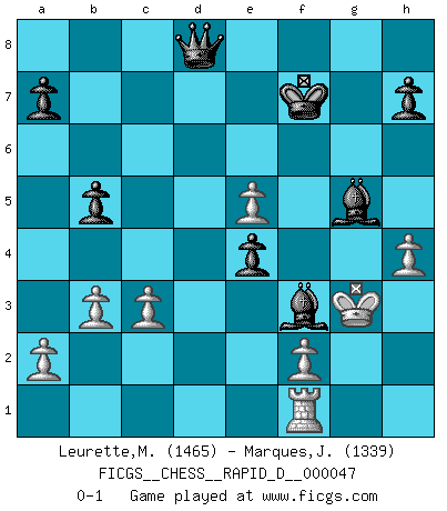Last move : 0-1 2010 December 27 19:0:39 [Event "FICGS__CHESS__RAPID_D__000047"] [Site "FICGS"] [Date "2010.11.08"] [Round "1"] [White "Leurette,Marc-Antoine"] [Black "Marques,Joao"] [Result "0-1"] [WhiteElo "1465"] [BlackElo "1339"] 1.e4 e5 2.Nf3 Nc6 3.Bc4 Nf6 4.Ng5 d5 5.exd5 Nxd5 6.Nxf7 Kxf7 7.Qf3+ Ke6 8.Nc3 Nce7 9.d4 c6 10.dxe5 b5 11.Bxd5+ Nxd5 12.O-O Be7 13.Bf4 Rf8 14.g3 g5 15.Nxd5 cxd5 16.Rae1 gxf4 17.Qg4+ Rf5 18.gxf4 Kf7 19.Re3 Rg5 20.fxg5 Bxg4 21.h4 Rc8 22.c3 Rc4 23.b3 Re4 24.Rxe4 dxe4 25.Kg2 Bf3+ 26.Kg3 Bxg5 0-1 Two knights defense : Fegatello attack Kingside Castling by player White (move 12) Player Black won this chess game. Follow this game move after move (download)It is the aim of the modern school, not to treat every position according to one general law, but according to the principle inherent in the position. (Richard Reti) Ich glaube nicht an Psychologie, ich glaube an gute Züge. (Robert James Fischer) A través de las casillas del tablero, los Indios explican el movimiento del tiempo y la edad, las influencias mas altas que controlan el mundo y los lazos que vinculan al Ajedrez con el alma humana. (Al-Masudi) L'ordinateur a tué l'originalité. Il n'y a plus guère d'aventures sur l'échiquier. (Jacob Murray) Creativity is allowing yourself to make mistakes. Art is knowing which ones to keep. (Scott Adams)