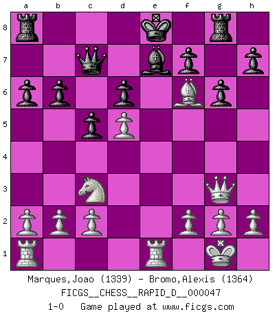 Last move : 1-0 2010 December 20 9:1:34 [Event "FICGS__CHESS__RAPID_D__000047"] [Site "FICGS"] [Date "2010.11.08"] [Round "1"] [White "Marques,Joao"] [Black "Bromo,Alexis"] [Result "1-0"] [WhiteElo "1339"] [BlackElo "1364"] 1.e4 e5 2.Nf3 Nc6 3.d4 exd4 4.Nxd4 Nxd4 5.Qxd4 b6 6.Bc4 Bb7 7.O-O c5 8.Qe3 d6 9.Nc3 a6 10.Bd5 Bxd5 11.exd5 Be7 12.Qg3 g6 13.Re1 Nf6 14.Bh6 Qc7 15.Bg7 Rg8 16.Bxf6 1-0 Scotch game Kingside Castling by player White (move 7) Player White won this chess game. Follow this game move after move (download)First-class players lose to second-class players because second-class players sometimes play a first-class game. (Siegbert Tarrasch) Moralische Siege zählen nicht. (Savielly Grigorievitsch Tartakower) Cuando me preguntan: -¿Cual es el secreto que te hace hacer mejores movidas que tus oponentes?, Yo respondo: Me da gusto que me pregunten eso, porque, como veran, hay una simple razón. Yo pienso mis propias movidas y dejo a mi oponente que el piense las suyas. (Alexander Alekhine) Les sacrifices démontrent seulement que quelqu'un a gaffé. (Savielly Tartacover) Fame, I have already. Now I need the money. (an elderly Steinitz)