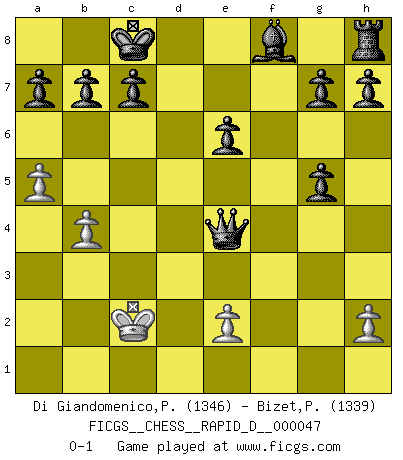 Last move : 0-1 2011 January 31 12:25:16 [Event "FICGS__CHESS__RAPID_D__000047"] [Site "FICGS"] [Date "2010.11.08"] [Round "1"] [White "Di Giandomenico,Pierino"] [Black "Bizet,Patrick"] [Result "0-1"] [WhiteElo "1346"] [BlackElo "1339"] 1.Nc3 d5 2.d4 Nf6 3.Be3 Nc6 4.Qd2 Bf5 5.O-O-O Nb4 6.a3 Nxc2 7.g4 Nxg4 8.Bg2 e6 9.Bg5 f6 10.Qxc2 Bxc2 11.Kxc2 fxg5 12.Nf3 Nxf2 13.Ne5 Nxh1 14.Bxh1 Qf6 15.Ne4 dxe4 16.Bxe4 O-O-O 17.b4 Rxd4 18.Rxd4 Qxe5 19.a4 Qxd4 20.a5 Qxe4+ 0-1 Dunst (Sleipner, Heinrichsen) Opening Queenside Castling by player White (move 5) Queenside Castling by player Black (move 16) Player Black won this chess game. Follow this game move after move (download)Pawn endings are to Chess what putting is to golf. (Cecil Purdy) Fischer: 'Remis!?' Uhlmann: 'Aber es muss doch dreimal Zugwiederholung sein!' Fischer: 'Sie nehmen das Remis an, wie ich es sage, sonst spiele ich weiter und werde Sie dann schlagen!' (Robert James Fischer) Uno por uno, yo los acribillé, mi superioridad muy pronto se volvio aparente. (Jose Capablanca) Il n'y a plus de joueurs du niveau de Jacob Murray dont la seule quête est le beau jeu, le plaisir de voir les pièces construire quelque chose. Sur 10 idées à la minute, 9 seront sans intérêt, la dernière s'avèrera géniale. (Christian Bauer) There are more things in heaven and earth than practically anywhere else. (Unknown)