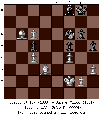 Last move : 1-0 2011 February 20 8:38:40 [Event "FICGS__CHESS__RAPID_D__000047"] [Site "FICGS"] [Date "2010.11.08"] [Round "1"] [White "Bizet,Patrick"] [Black "Budnar,Milos"] [Result "1-0"] [WhiteElo "1339"] [BlackElo "1351"] 1.e4 e5 2.Nf3 Nf6 3.Nxe5 d6 4.Nf3 Nxe4 5.d3 Nf6 6.d4 h6 7.Be2 Bg4 8.c4 Be7 9.Qb3 O-O 10.Qxb7 Nbd7 11.Nc3 c5 12.Qb3 Qb6 13.Qxb6 axb6 14.d5 Bxf3 15.Bxf3 Ne5 16.Be2 Nh7 17.O-O f5 18.f4 Nd7 19.Re1 g6 20.Nb5 Rac8 21.Bd2 Rf7 22.a4 Bf8 23.a5 bxa5 24.Rxa5 Nhf6 25.Bd3 Re8 26.Ra6 Rxe1+ 27.Bxe1 Ne8 28.Ba5 Ndf6 29.b4 Re7 30.Kf2 Rd7 31.bxc5 dxc5 32.h3 Nd6 33.Nxd6 Rxd6 34.Rc6 h5 35.Bb6 Rxc6 36.dxc6 1-0 Petrov : French attack Kingside Castling by player Black (move 9) Kingside Castling by player White (move 17) Player White won this chess game. Follow this game move after move (download)When asked, -How is that you pick better moves than your opponents?, I responded: I'm very glad you asked me that, because, as it happens, there is a very simple answer. I think up my own moves, and I make my opponent think up his. (Alexander Alekhine) Wenn Dein Gegner dir ein Remis anbietet, versuch herauszufinden, weshalb er glaubt schlechter zu stehen. (Nigel Short) El Ajedrez es el arte del análisis. (Mikhail Botvinnik) Le joueur d'Echecs qui veut atteindre le top est obligé de développer son propre credo créatif. Alexeï Stepanovicth Souétine. Il est facile d'écrire des livres ! Ce qui est difficile, c'est de jouer ! (Alexeï Stepanovicth Souétine) I live to kill Traxler counterattack. (Ilmars Cirulis)