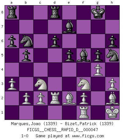 Last move : 1-0 2011 February 3 19:25:50 [Event "FICGS__CHESS__RAPID_D__000047"] [Site "FICGS"] [Date "2010.11.08"] [Round "1"] [White "Marques,Joao"] [Black "Bizet,Patrick"] [Result "1-0"] [WhiteElo "1339"] [BlackElo "1339"] 1.e4 c5 2.Nf3 d6 3.d4 cxd4 4.Nxd4 Nf6 5.Nc3 a6 6.Be2 e5 7.Nf3 Be6 8.O-O Be7 9.Bg5 Nbd7 10.Qd2 h6 11.Bh4 O-O 12.Rad1 b5 13.a3 Qb6 14.h3 Rfd8 15.Kh1 Qb7 16.Qe3 Qb6 17.Qxb6 Nxb6 18.Rd2 g5 19.Bg3 Nh5 20.Bh2 f5 21.exf5 Bxf5 22.g4 1-0 Sicilian : Najdorf, Opovcensky variation Kingside Castling by player White (move 8) Kingside Castling by player Black (move 11) Player White won this chess game. Follow this game move after move (download)Of all my Russian books, the defense contains and diffuses the greatest 'warmth' which may seem odd seeing how supremely abstract Chess is supposed to be. (Vladimir Nabokov) Schach ist Kampf, hauptsächlich jedoch gegen die eigenen Fehler. (Savielly Grigorievitsch Tartakower) El jugador táctico sabe que hacer cuando hay algo que hacer; mientras que el estratega sabe que hacer cuando no hay nada que hacer. (Gerald Abrahams) Les erreurs sont comme les malheurs, elles n'arrivent jamais seules. (Siegbert Tarrasch) To err is human, but to really foul things up requires a computer. (Farmer's Almanac, 1978)