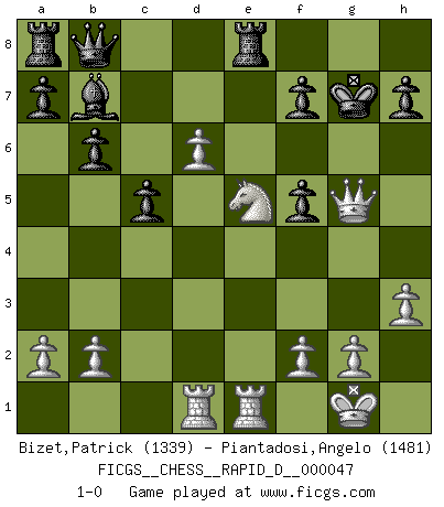 Last move : 1-0 2011 January 28 23:38:0 [Event "FICGS__CHESS__RAPID_D__000047"] [Site "FICGS"] [Date "2010.11.08"] [Round "1"] [White "Bizet,Patrick"] [Black "Piantadosi,Angelo"] [Result "1-0"] [WhiteElo "1339"] [BlackElo "1481"] 1.e4 d5 2.exd5 Nf6 3.d4 Nxd5 4.c4 Nf6 5.Nc3 g6 6.Nf3 Bg7 7.Be2 O-O 8.h3 c5 9.O-O Nc6 10.d5 Na5 11.Re1 b6 12.Bg5 Nb7 13.Qd2 Nd6 14.Bd3 e6 15.Rad1 Qc7 16.Bh6 exd5 17.Nxd5 Nxd5 18.cxd5 Bb7 19.Bb1 Rfe8 20.Bxg7 Kxg7 21.Ne5 Nf5 22.d6 Qb8 23.Bxf5 gxf5 24.Qg5+ 1-0 Scandinavian : Marshall variation Kingside Castling by player Black (move 7) Kingside Castling by player White (move 9) Player White won this chess game. Follow this game move after move (download)I won't play with you anymore. You have insulted my friend. - When an opponent cursed himself for a blunder. (Miguel Najdorf) Karpov ist ein Museumsstück. (Garry Kasparov) La estratégia requiere pensar, la táctica requiere observación. (Max Euwe) Echiquier : carré parfait, comme la Jérusalem nouvelle décrite par l'auteur de l'Apocalypse, huit cases sur huit, exaltation du chiffre 4, symbole du cosmos aux quatre horizons... où le noir et le blanc, l'ombre et la lumière, le mal et le bien s'entremêlent et se conjuguent. (Robert Couffignal, Le Gambit du poète) History is the quarrels of popes and kings, with wars or pestilences in every page; the men all so good for nothing, and hardly any women at all. (Jane Austen)