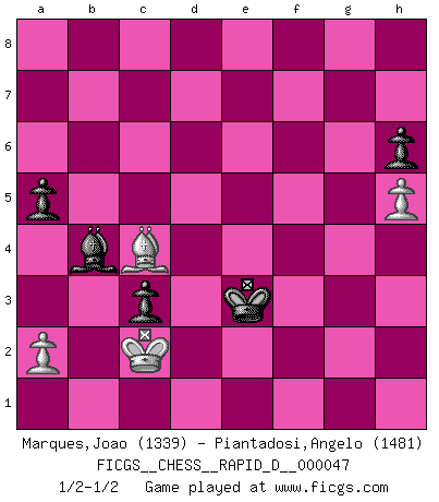 Last move : 1/2-1/2 2011 February 25 3:32:34 [Event "FICGS__CHESS__RAPID_D__000047"] [Site "FICGS"] [Date "2010.11.08"] [Round "1"] [White "Marques,Joao"] [Black "Piantadosi,Angelo"] [Result "1/2-1/2"] [WhiteElo "1339"] [BlackElo "1481"] 1.e4 Nf6 2.e5 Nd5 3.c4 Nb6 4.d4 d6 5.exd6 exd6 6.Nf3 Bg4 7.Be2 N8d7 8.b3 Be7 9.O-O O-O 10.Nc3 Bf6 11.Ne4 Be7 12.Bb2 Nf6 13.Qc2 Nxe4 14.Qxe4 Bxf3 15.Bxf3 c6 16.Rae1 Bf6 17.Re2 Re8 18.Qd3 Rxe2 19.Qxe2 Qd7 20.Re1 Kf8 21.Bg4 Qe7 22.Bf3 Re8 23.Qxe7+ Rxe7 24.Kf1 d5 25.Rxe7 Kxe7 26.Ke2 dxc4 27.bxc4 Nxc4 28.Bc3 Nb6 29.Kd3 Nd5 30.Bd2 Kd6 31.Kc4 Ne7 32.Bb4+ Kd7 33.Bxe7 Bxe7 34.d5 f6 35.dxc6+ bxc6 36.h3 a5 37.Be2 Kd6 38.Kd4 c5+ 39.Ke4 g6 40.f3 f5+ 41.Ke3 Kd5 42.Ba6 c4 43.g3 Bc5+ 44.Kd2 Kd4 45.g4 fxg4 46.fxg4 c3+ 47.Kc2 Bb4 48.h4 Ke3 49.h5 gxh5 50.gxh5 h6 51.Bc4 1/2-1/2 Alekhine's defense Kingside Castling by player White (move 9) Kingside Castling by player Black (move 9) 10 pieces endgame at move 49 : White KBPP , Black KBPPPP WHITE : King + 1 Bishop 2 Pawns BLACK : King + 1 Bishop 4 Pawns 9 pieces endgame at move 50 : White KBPP , Black KBPPP WHITE : King + 1 Bishop 2 Pawns BLACK : King + 1 Bishop 3 Pawns This chess game ended in a draw. Follow this game move after move (download)The combination player thinks forward; he starts from the given position, and tries the forceful moves in his mind. (Emanuel Lasker) Verschiedene, sehr schätzbare und im Laufe des Lebens nützliche Eigenschaften des Geistes können durch das Schachspiel erworben und gekräftigt werden, so dass sie zu Gewohnheiten werden, die uns nie im Stich lassen. (Benjamin Franklin) Combinaciones deslumbrantes son para la mayoría, mover madera es para los pocos. (Georg Kieninger) La guerre est enfant de la passion, la passion est enfant du narcissisme et le narcissisme est l'enfant. (...) Une autre partie ? (Thibault de Vassal) Employ the attack like tactic of defense. (Chinese proverb)