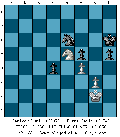Last move : 1/2-1/2 2010 November 9 19:20:11 [Event "FICGS__CHESS__LIGHTNING_SILVER__000056"] [Site "FICGS"] [Date "2010.11.09"] [Round "1"] [White "Perikov,Yuriy"] [Black "Evans,David"] [Result "1/2-1/2"] [WhiteElo "2207"] [BlackElo "2194"] 1.d4 Nf6 2.Nf3 d5 3.c4 e6 4.Nc3 c6 5.e3 Nbd7 6.Bd3 dxc4 7.Bxc4 b5 8.Bd3 Bb7 9.e4 b4 10.Na4 c5 11.e5 Nd5 12.Nxc5 Nxc5 13.dxc5 Bxc5 14.Qa4+ Ke7 15.O-O h6 16.Ba6 Bxa6 17.Qxa6 Rc8 18.Bd2 Qb6 19.Qd3 g6 20.a4 Kf8 21.a5 Qb7 22.Rfc1 Kg7 23.h3 Rhd8 24.Qe4 Qb5 25.g3 Rc7 26.Kg2 Rdc8 27.h4 h5 28.Ng5 Be7 29.Rxc7 Rxc7 30.Nf3 Qa6 31.Bg5 b3 32.Bxe7 Nxe7 33.Rd1 Qxa5 34.Rd3 Qb6 35.Nd2 Rc2 36.Rxb3 Qc5 37.Qd3 Qc6+ 38.Nf3 Nd5 39.Qe4 Rc4 40.Qe1 Rc1 41.Qe4 a5 42.Rd3 Rc4 43.Qe2 a4 44.Rd2 Ne7 45.Rd6 Qc5 46.Rd8 Nd5 47.Ng5 Qc7 48.Rd7 Qxd7 49.Qxc4 Qb7 50.Kf1 Qxb2 51.Qxa4 Qxe5 52.Qa7 Qc7 53.Qd4+ Nf6 54.Nf3 Qe7 55.Kg2 Kg8 56.Ne5 Nd5 57.Nf3 Qb7 58.Kg1 Qb1+ 59.Kg2 Qb6 60.Qa4 Qb7 61.Qe4 Qb2 62.Ne5 Nf6 63.Qe1 Qd4 64.Kg1 Ne4 65.Nf3 Qd3 66.Kg2 Qd5 67.Qb4 g5 68.Qb8+ Kg7 69.hxg5 Nxg5 70.Qe5+ Kg6 71.Qxd5 exd5 72.Ne1 Kf5 73.f3 d4 74.Nd3 Ne6 75.Kf1 f6 76.Kg2 Kg5 77.Kh3 f5 78.f4+ Kg6 79.Ne5+ Kh6 80.Kg2 1/2-1/2 Queen's pawn game Kingside Castling by player White (move 15) 10 pieces endgame at move 71 : White KQNPP , Black KNPPP WHITE : King + 1 Queen 1 Knight 2 Pawns BLACK : King + 1 Knight 3 Pawns 9 pieces endgame at move 71 : White KNPP , Black KNPPP WHITE : King + 1 Knight 2 Pawns BLACK : King + 1 Knight 3 Pawns This chess game ended in a draw. Follow this game move after move (download)Chess is not like life... it has rules ! (Mark Pasternak) Um sich vor der Gefahr einer Erkältung zu schützen, sorge der wanderlustige König beizeiten für ein brauchbares Versteck. (Aaron Nimzowitsch) Tu cuerpo tiene que estar en óptima condición. Tu Ajedrez se deteriora como lo hace tu cuerpo. No puedes separar la mente y el cuerpo. (Bobby Fischer) Psychologiquement, tu dois avoir confiance en toi même, mais cette confiance doit être basée sur des faits. (Robert Fischer) Secret operations are essential in war; upon them the army relies to make its every move. (Sun Tzu)