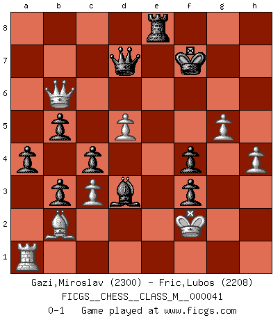 Last move : 0-1 2012 August 4 11:17:51 [Event "FICGS__CHESS__CLASS_M__000041"] [Site "FICGS"] [Date "2010.11.11"] [Round "1"] [White "Gazi,Miroslav"] [Black "Fric,Lubos"] [Result "0-1"] [WhiteElo "2300"] [BlackElo "2208"] 1.e4 e6 2.d4 d5 3.Nc3 Bb4 4.e5 c5 5.a3 Bxc3+ 6.bxc3 Ne7 7.Bd3 Nbc6 8.Nf3 Qa5 9.O-O c4 10.Be2 Qxc3 11.Bd2 Qb2 12.c3 Bd7 13.a4 Na5 14.Rb1 Qa2 15.Ra1 Qb3 16.Qc1 Qb6 17.Bd1 h6 18.Bc2 Nec6 19.Bf4 Nb3 20.Bxb3 cxb3 21.Qb2 Na5 22.Nd2 f5 23.exf6 O-O 24.Be5 gxf6 25.Bf4 Be8 26.Bxh6 Rf7 27.Rfe1 Rh7 28.Bf4 Bg6 29.Re2 Re8 30.Bg3 Kf7 31.Rc1 Rg7 32.Bf4 Bd3 33.R2e1 R7g8 34.Bg3 Bf5 35.Re2 Rc8 36.Ra1 Rc6 37.Re3 Nc4 38.Nxc4 dxc4 39.R3e1 Qa5 40.f3 Bd3 41.Kh1 Qd5 42.Bf4 Ra6 43.Ra3 Ra5 44.Bg3 Qc6 45.Bf4 a6 46.Qf2 Rxa4 47.Rxa4 Qxa4 48.Bc1 Qc6 49.h4 a5 50.Bb2 b5 51.Ra1 Qc7 52.Qe1 Ra8 53.g4 a4 54.Kg2 Re8 55.Qe3 e5 56.d5 Qd7 57.Kg3 f5 58.Qb6 f4+ 59.Kf2 e4 60.g5 exf3 0-1 French : Winawer, Advance, 6...Ne7 Kingside Castling by player White (move 9) Kingside Castling by player Black (move 23) Player Black won this chess game. Follow this game move after move (download)Openings teach you openings. Endgames teach you chess ! (Stephan Gerzadowicz) Der zweitbeste Zug ist oft der einzig richtige. (Savielly Grigorievitsch Tartakower) El Ajedrez te enseña a controlarl la excitación inicial que sientes cuando vez algo que parece bueno y te enseña a pensar objetivamente cuando te encuentras en problemas. (Stanley Kubrick) La victoire dans une partie d'Echecs appartient la plupart du temps à celui qui voit un peu plus loin que l'adversaire. (Lasker) Always two there are. No more no less. A master, and an apprentice. (Master Yoda in Star Wars ep.1)