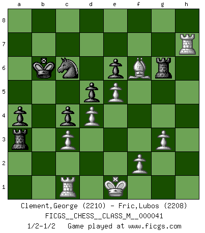 Last move : 1/2-1/2 2011 June 8 22:59:50 [Event "FICGS__CHESS__CLASS_M__000041"] [Site "FICGS"] [Date "2010.11.11"] [Round "1"] [White "Clement,George"] [Black "Fric,Lubos"] [Result "1/2-1/2"] [WhiteElo "2210"] [BlackElo "2208"] 1.e4 e6 2.d4 d5 3.Nc3 Bb4 4.e5 c5 5.a3 Bxc3+ 6.bxc3 Ne7 7.Qg4 O-O 8.Bd3 c4 9.Bh6 Ng6 10.Bxg6 fxg6 11.Be3 Bd7 12.h4 Rf5 13.Ne2 Nc6 14.Ng3 Qa5 15.Bd2 Rf7 16.h5 Ne7 17.Qh3 gxh5 18.Qxh5 g6 19.Qg4 Kf8 20.Ne2 Qa4 21.Kd1 Bc8 22.Bg5 Qd7 23.Nf4 Ke8 24.Kd2 Kd8 25.Rh3 Kc7 26.Rah1 h5 27.Qg3 Nf5 28.Qh2 b5 29.Bf6 a5 30.Nxg6 b4 31.Qf4 Qa4 32.Nh4 Ne7 33.Qf3 Bd7 34.Qxh5 R7f8 35.Ra1 Nc6 36.Qd1 bxc3+ 37.Ke1 Rg8 38.Rxc3 Rab8 39.Kf1 Qb5 40.Rh3 Be8 41.c3 Qb2 42.Qc1 a4 43.g3 Qxc1+ 44.Rxc1 Rb3 45.Ng2 Kb6 46.Nf4 Rxa3 47.Rh6 Bf7 48.Rh7 Bg6 49.Nxg6 Rxg6 50.Ke1 1/2-1/2 French : Winawer, Advance, poisoned pawn variation Kingside Castling by player Black (move 7) This chess game ended in a draw. Follow this game move after move (download)Help your pieces so they can help you. (Paul Morphy) Viele Opfer benötigen überhaupt keine konkrete Berechnung. Es genügt sich die entstehende Position kurz vorzustellen, um uns davon zu überzeugen, dass das Opfer korrekt ist. (Mikhail Nekhemyevich Tal) Los finales de Peón son del Ajedrez lo que el cesped es del Golf. (Cecil Purdy) Demandez au pauvre Cg1 ce qu'il en pense. Eduard Gufeld à propos de la variante Saemisch de l'Est-Indienne. Chess, like love, like music, has the power to make people happy. (Siegbert Tarrasch)