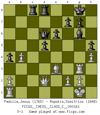 Last move : 0-1 2011 April 4 2:39:55 [Event "FICGS__CHESS__CLASS_C__000161"] [Site "FICGS"] [Date "2010.11.11"] [Round "1"] [White "Padilla,Jesus"] [Black "Ropokis,Dimitrios"] [Result "0-1"] [WhiteElo "1765"] [BlackElo "1848"] 1.e4 c6 2.d4 d5 3.e5 Bf5 4.Nf3 e6 5.Nbd2 Ne7 6.Nb3 Nd7 7.Be2 Qc7 8.O-O c5 9.dxc5 Nc6 10.Nbd4 Bg6 11.Nb5 Qb8 12.Nd6+ Bxd6 13.cxd6 Ncxe5 14.Nxe5 Nxe5 15.Bb5+ Nc6 16.Bf4 O-O 17.Re1 a6 18.Bxc6 bxc6 19.b3 Rd8 20.c3 c5 21.h4 h5 22.Qd2 Qb6 23.Re3 a5 24.Rg3 a4 25.b4 cxb4 26.cxb4 Rac8 27.Be3 Qxd6 0-1 This chess game has been lost on time (started : 2010.11.11 19:59:42) Caro-Kann : Advance variation Kingside Castling by player White (move 8) Kingside Castling by player Black (move 16) Player Black won this chess game. Follow this game move after move (download)I have added these principles to the law: get the Knights into action before both Bishops are developed. (Emanuel Lasker) Offener Brief an US-Präsident Bush anlässlich der Verhaftung Bobby Fishers: Verhaften Sie mich. Stecken Sie mich in dieselbe Zelle wie Bobby Fisher und geben Sie uns ein Schachspiel mit. (Boris Vassilievich Spassky) En manos de Fischer's, una diminuta ventaja teórica es tan buena como tener una Reina de ventaja. (Isaac Kashdan) Comme les marins qui ont mille raisons différentes d'aller en mer, les joueurs d'échecs en ont tout autant avant de s'installer devant une table et jouer... (Vincent Bertignac, philosophe) Art is the triumph over chaos. (John Cheever)