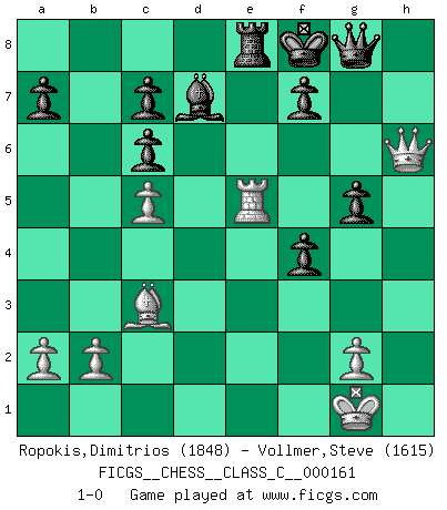 Last move : 1-0 2010 November 23 2:23:35 [Event "FICGS__CHESS__CLASS_C__000161"] [Site "FICGS"] [Date "2010.11.11"] [Round "1"] [White "Ropokis,Dimitrios"] [Black "Vollmer,Steve"] [Result "1-0"] [WhiteElo "1848"] [BlackElo "1615"] 1.e4 e5 2.f4 exf4 3.Nf3 Be7 4.Be2 Nf6 5.Nc3 d5 6.exd5 Nxd5 7.Nxd5 Qxd5 8.O-O O-O 9.d4 g5 10.c4 Qd6 11.h4 h6 12.c5 Qg6 13.Re1 Nc6 14.Bb5 Bf6 15.hxg5 hxg5 16.Bxc6 bxc6 17.Ne5 Bxe5 18.Rxe5 Be6 19.Qe2 Rfd8 20.Bd2 Rxd4 21.Bc3 R4d8 22.Qf3 Bd7 23.Rae1 Re8 24.Re7 Rxe7 25.Rxe7 Rd8 26.Qd1 Qf5 27.Qh5 Kf8 28.Re5 Qg6 29.Qh8+ Qg8 30.Qf6 Re8 31.Qh6+ 1-0 KGA : Cunningham defense Kingside Castling by player White (move 8) Kingside Castling by player Black (move 8) Player White won this chess game. Follow this game move after move (download)There just isn't enough televised Chess. (David Letterman) Du weisst es gibt ein Problem mit Computern und Fernschach, wenn jeder eine Rating von 2450 hat. (John Christen Knudsen) Diferente gente reacciona diferentemente en aceptar la derrota. (Bobby Fischer) Horreur, mais aussi harmonie suprême : qu'y avait-il en effet au monde en dehors des échecs ? Le brouillard, l'inconnu, le non-être... (Vladimir Nabokov) Gambling : The sure way of getting nothing from something. (Wilson Mizner)