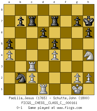 Last move : 0-1 2011 May 4 17:33:11 [Event "FICGS__CHESS__CLASS_C__000161"] [Site "FICGS"] [Date "2010.11.11"] [Round "1"] [White "Padilla,Jesus"] [Black "Schutte,John"] [Result "0-1"] [WhiteElo "1765"] [BlackElo "1800"] 1.e4 c5 2.Nf3 d6 3.d4 cxd4 4.Nxd4 Nf6 5.Nc3 a6 6.Bg5 e6 7.f4 Qb6 8.Qd2 Qxb2 9.Rb1 Qa3 10.f5 Nc6 11.Rb3 Qc5 12.Be3 Nxd4 13.Qxd4 Qxd4 14.Bxd4 Be7 15.a4 O-O 16.Be2 Nd7 17.O-O Bd8 18.fxe6 fxe6 19.Rd1 Bc7 20.Be3 h6 21.Bg4 Re8 22.Nb1 Re7 23.Nd2 Ne5 24.Bh3 Kh7 25.Bb6 a5 26.Nf3 Bxb6+ 27.Rxb6 Nc4 28.Rb3 e5 29.Bxc8 Rxc8 30.Rc3 R8c7 31.Nh4 Nb2 0-1 This chess game has been lost on time (started : 2010.11.11 19:59:42) Sicilian : Najdorf, 7...Qb6 Kingside Castling by player Black (move 15) Kingside Castling by player White (move 17) Player Black won this chess game. Follow this game move after move (download)A thorough understanding of the typical mating continuations makes the most complicated sacrificial combinations leading up to them not only not difficult, but almost a matter of course. (Siegbert Tarrasch) Ein Großmeister muß tausende Partien in seinem Kopf speichern, denn diese sind für Ihn, was die Worte der Muttersprache für gewöhnliche Leute sind, oder Noten für Musiker... (Garry Kasparov) Si el Ajedrez es una ciencia, es la mas inexacta. Si el Ajedrez es un arte, es demasiado inexacto para ser visto como tal. Si el Ajedrez es un deporte, es demasiado esotérico. Si el Ajedrez es un juego, es demasiado exigente para ser solo un juego. Si el Ajedrez es una aventura, es una muy demandante. Si el Ajedrez es una pasión, es una muy gratificante. Si el Ajedrez es la vida, es una muy triste. (Anónimo) Les Echecs représentent une sphère d'idées créatrices basée sur la volonté des deux protagonistes. (Smyslov) Fortune favours the audacious. (Desiderius Erasmus)