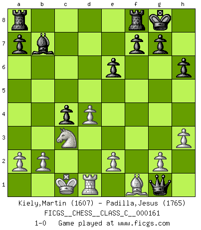 Last move : 1-0 2011 May 17 6:13:50 [Event "FICGS__CHESS__CLASS_C__000161"] [Site "FICGS"] [Date "2010.11.11"] [Round "1"] [White "Kiely,Martin"] [Black "Padilla,Jesus"] [Result "1-0"] [WhiteElo "1607"] [BlackElo "1765"] 1.d4 Nf6 2.c4 e6 3.Nc3 d5 4.Nf3 c6 5.Bg5 Be7 6.Ne5 h6 7.Be3 O-O 8.Qb3 Nbd7 9.c5 b6 10.cxb6 Nxb6 11.Nxc6 Qc7 12.Ne5 Nc4 13.Nxc4 dxc4 14.Qc2 Bb7 15.O-O-O Ng4 16.h3 Nxe3 17.fxe3 Bg5 18.Qd2 Qg3 19.Rg1 Bxe3 20.Qxe3 Qxe3+ 21.Rd2 Qxg1 22.Rd1 1-0 This chess game has been lost on time (started : 2010.11.11 19:59:42) Queen's pawn game Kingside Castling by player Black (move 7) Queenside Castling by player White (move 15) Player White won this chess game. Follow this game move after move (download)Chess is above all, a fight ! (Emanuel Lasker) Das Schach ist nichts für kleine Geister, es beansprucht einen vollen Mann, der sich nicht sklavisch an das Überlieferte hält, sondern selbständig die Tiefen des Spiels zu ergründen sucht. (Wilhelm Steinitz) Realmente no sabemos como el juego fue inventado, aunque hay sospechas. Tan pronto como descubramos a los culpables, se los haremos saber. (Bruce Pandolfini) Les Echecs ont trois composantes : le temps, l'espace et le matériel en dernier. (Mikhail Tal) There's always a bigger fish. (Qui-Gon Jinn in Star Wars ep.1)