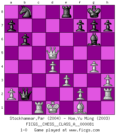 Last move : 1-0 2011 February 27 13:53:43 [Event "FICGS__CHESS__CLASS_A__000081"] [Site "FICGS"] [Date "2010.11.11"] [Round "1"] [White "Stockhammar,Par"] [Black "Hoe,Yu Ming"] [Result "1-0"] [WhiteElo "2004"] [BlackElo "2003"] 1.d4 d5 2.Nf3 Nf6 3.e3 Bf5 4.c4 c6 5.Nc3 e6 6.Nh4 Bg4 7.Qb3 b6 8.h3 Bh5 9.g4 Ne4 10.Nxe4 Qxh4 11.cxd5 cxd5 12.Nc3 Bg6 13.Nxd5 exd5 14.Qxd5 Bb4+ 15.Bd2 Bxd2+ 16.Kxd2 O-O 17.Qxa8 Re8 18.Rh2 Qe7 19.Qd5 Qb4+ 20.Kd1 Qxb2 21.Rc1 1-0 Queen's pawn game Kingside Castling by player Black (move 16) Player White won this chess game. Follow this game move after move (download)Without error there can be no brilliancy. (Emanuel Lasker) Ich weiss nicht was Gott gegen mich auf 1.e4 antworten würde. (Robert James Fischer) El Ajedrez es realmente noventa y nueve por ciento calculación. (Soltis) Si le désir cupide (et stupide) de gagner est une inépuisable source de souffrance, une combinaison brillante sur l'échiquier est une découverte : le coquelicot qui s'épanouit lorsque apparaît la Voie Lactée. (Arrabal) I've lost money so fast in these clubs it's left me reeling. I've read every poker book ever written, but the only way to get better at the game is to go out and play with people who are really good. The problem is, you stand to lose a lot of money doing it. (Matt Damon)